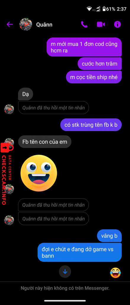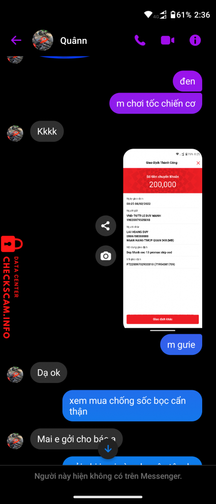 诈骗者警报: Lai Hoang Duy 已报告: November 16, 2024 诈骗者信息 全名: Lai Hoang Duy 支付网关: MB bank 支付账户: 0806788388888 类别: 市场诈骗 来源: Checkscam 证据文件 报告描述 Lừa đảo bán điện thoại rẻ để lừa cọc 评论 您的评论 添加评论 暂无评论。成为第一个分享您与此诈骗者经历的人。