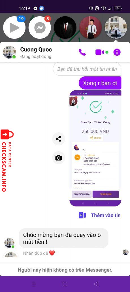 诈骗者警报: Lê Cường Quốc 已报告: November 16, 2024 诈骗者信息 全名: Lê Cường Quốc 支付网关: Mb bank 支付账户: 09408529999 类别: 市场诈骗 来源: Checkscam 证据文件 报告描述 Lê Cường Quốc lừa đảo 325k tiền mở khóa Facebook CTK lừa đảo: Lê Cường Quốc STK lừa đảo 09408529999 – Mb Bank 评论 您的评论 添加评论 暂无评论。成为第一个分享您与此诈骗者经历的人。