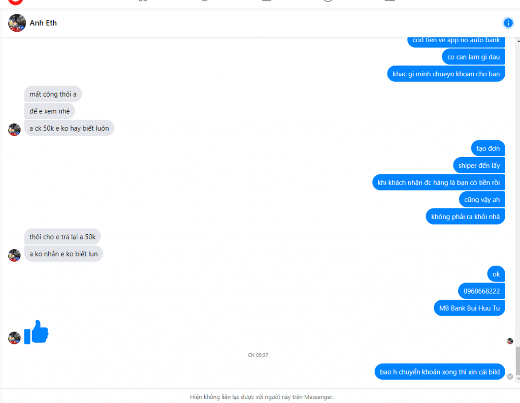 诈骗者警报: Le Ngoc Anh 已报告: November 16, 2024 诈骗者信息 全名: Le Ngoc Anh 支付网关: HDBANK 支付账户: 099704070054675 类别: 市场诈骗 来源: Checkscam 证据文件 报告描述 Đặt cọc mua hàng. Linh kiện máy tính. Sau 1 tuần không chuyển hàng. Mình giục thì chặn luôn Facebook 评论 您的评论 添加评论 暂无评论。成为第一个分享您与此诈骗者经历的人。