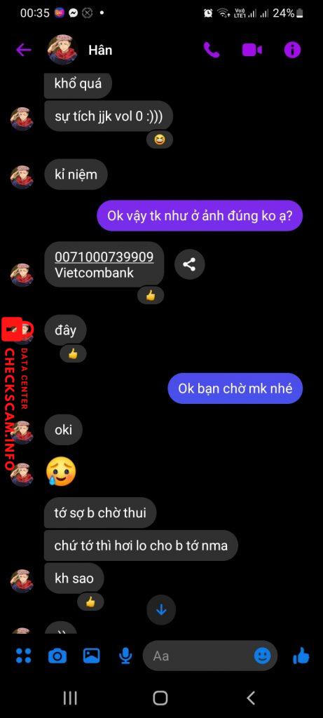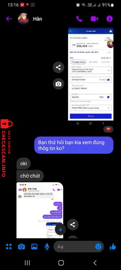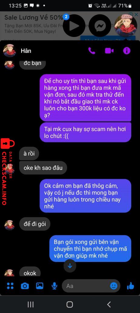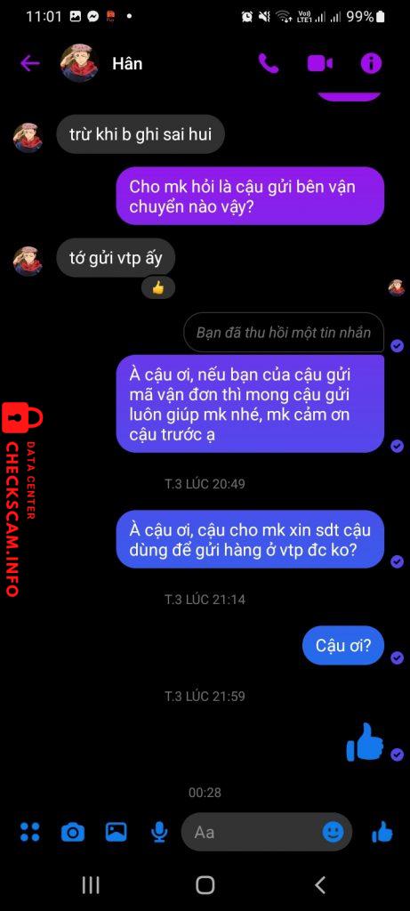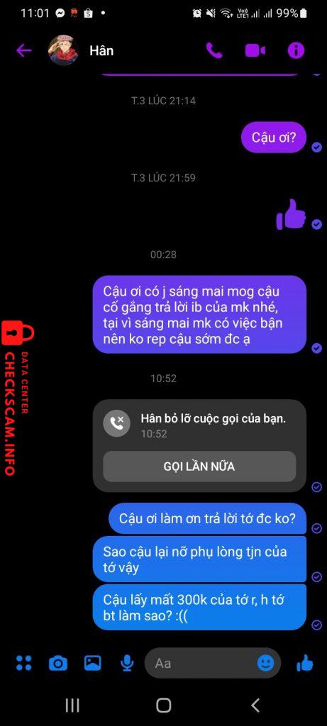 诈骗者警报: LE QUOC TRUNG 已报告: November 16, 2024 诈骗者信息 全名: LE QUOC TRUNG 支付网关: Vietcombank 支付账户: 0071000739909 类别: 市场诈骗 来源: Checkscam 证据文件 报告描述 Nó kêu pass gấp để lấy tiền trả tiền trọ nhưg đến khi ck cho nó xong thì nó cứ lấy lí do nhây ko đưa mã vận đơn và về sau bơ luôn tin nhắn của buyer 评论 您的评论 添加评论 暂无评论。成为第一个分享您与此诈骗者经历的人。