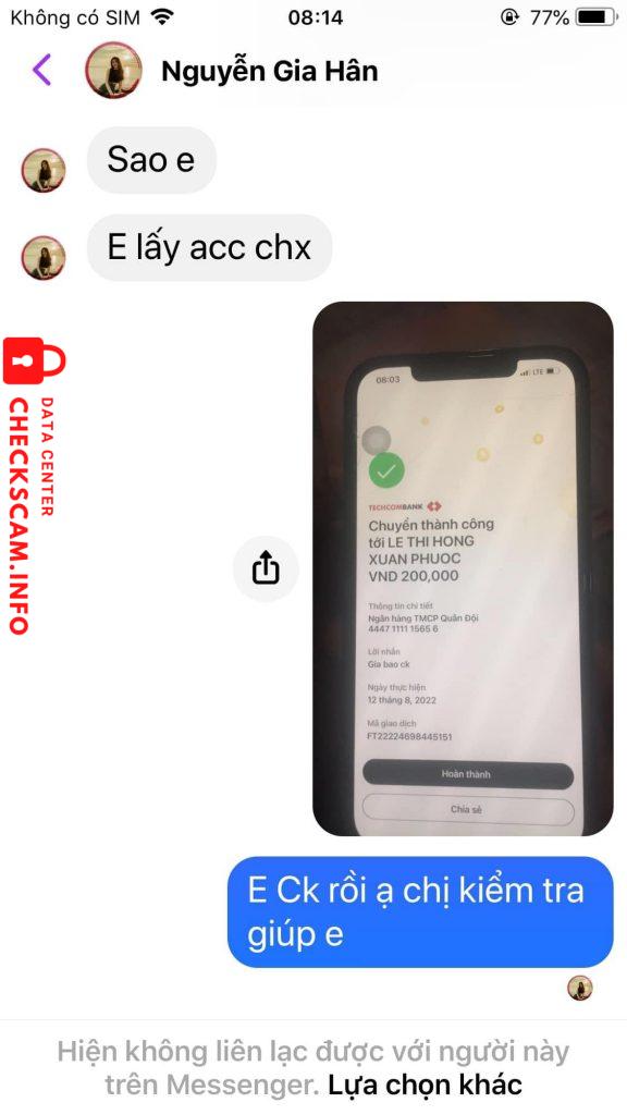 诈骗者警报: Lê Thị Hồng Xuân Phước 已报告: November 16, 2024 诈骗者信息 全名: Lê Thị Hồng Xuân Phước 支付网关: MB Bank 支付账户: 4447111115656 类别: 市场诈骗 来源: Checkscam 证据文件 报告描述 lừa đảo qua mạng 评论 您的评论 添加评论 暂无评论。成为第一个分享您与此诈骗者经历的人。
