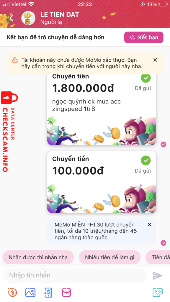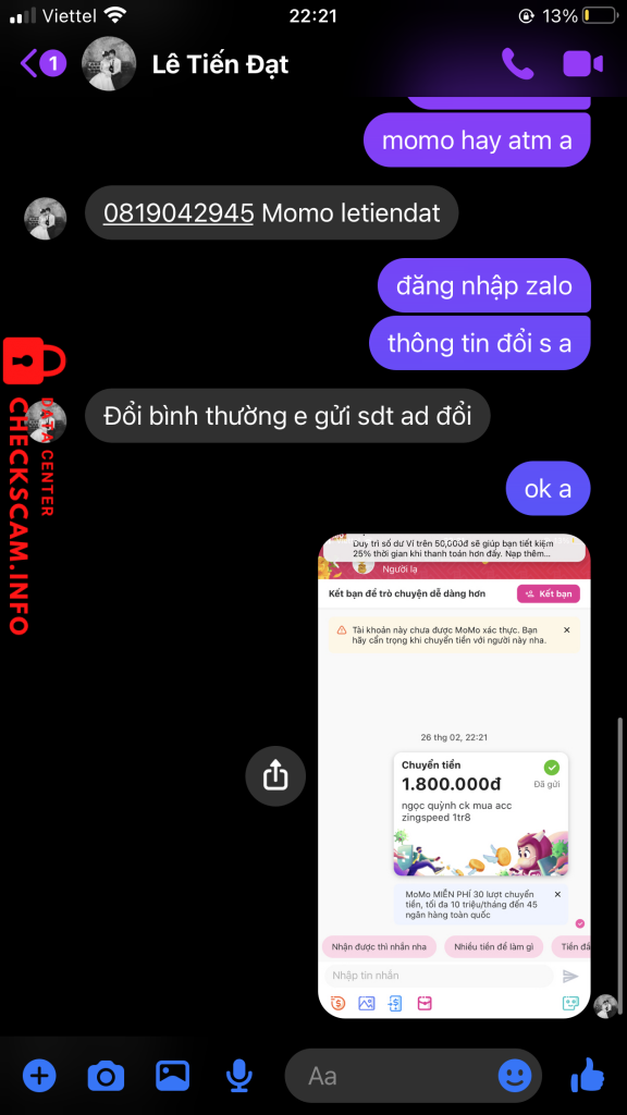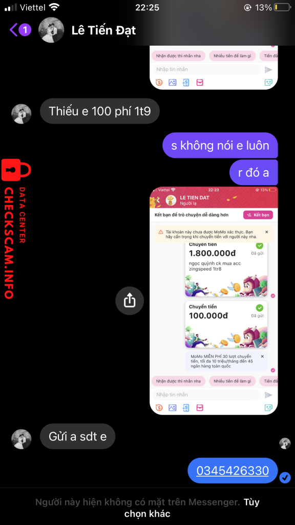 诈骗者警报: lê tiến đạt 已报告: November 16, 2024 诈骗者信息 全名: lê tiến đạt 电话号码: 0819042945 支付网关: momo 支付账户: 0819042945 类别: 市场诈骗 来源: Checkscam 证据文件 报告描述 lừa đảo chiếm đoạt tài sản qua trung gian hình thức mua bán 评论 您的评论 添加评论 暂无评论。成为第一个分享您与此诈骗者经历的人。