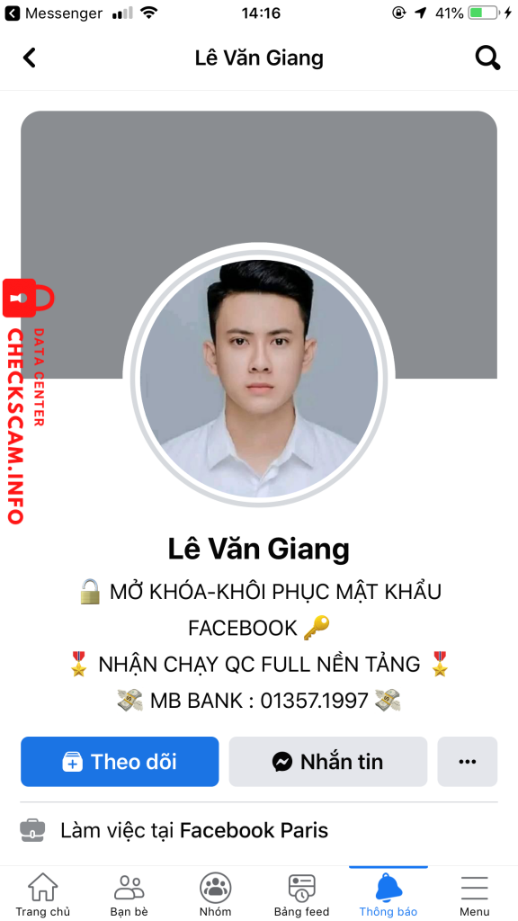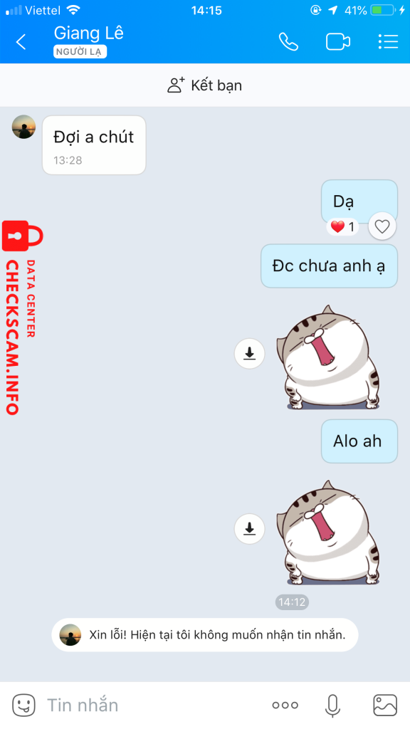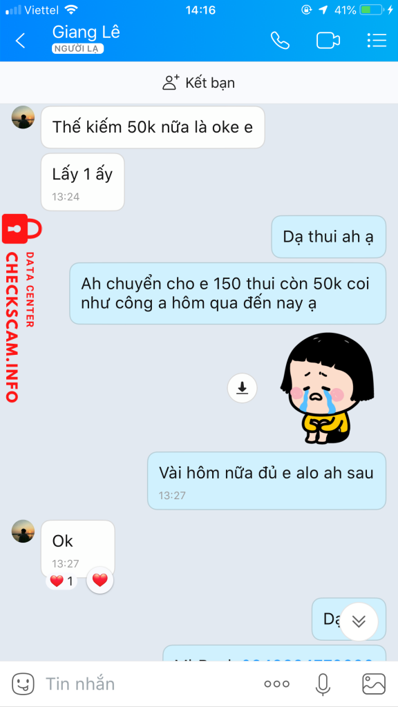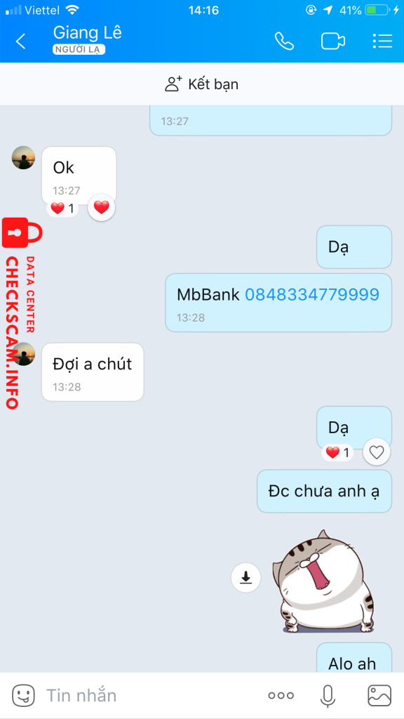 诈骗者警报: LÊ VĂN GIANG 已报告: November 16, 2024 诈骗者信息 全名: LÊ VĂN GIANG 支付网关: MB BANK 支付账户: 0135719995 类别: 市场诈骗 来源: Checkscam 证据文件 报告描述 Fb mình bị 956 có nhờ b này lấy lại và … 评论 您的评论 添加评论 暂无评论。成为第一个分享您与此诈骗者经历的人。