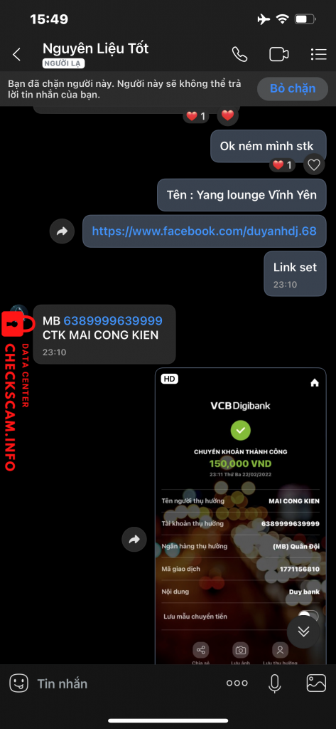 诈骗者警报: MAI CÔNG KIÊN 已报告: November 16, 2024 诈骗者信息 全名: MAI CÔNG KIÊN 支付网关: Mb Bank 支付账户: 6389999639999 类别: 市场诈骗 来源: Checkscam 证据文件 报告描述 Lôi kéo thành viên vào nhóm Nguyên Liệu ADS Gold xong lừa đảo thành viên hiện đag có 400 người & link nhóm : https://zalo.me/g/erihba979 评论 您的评论 添加评论 暂无评论。成为第一个分享您与此诈骗者经历的人。