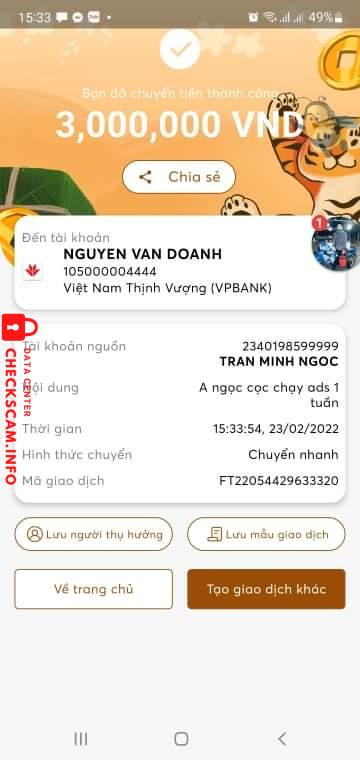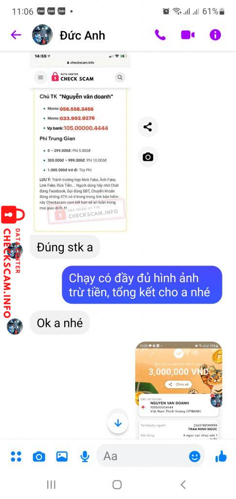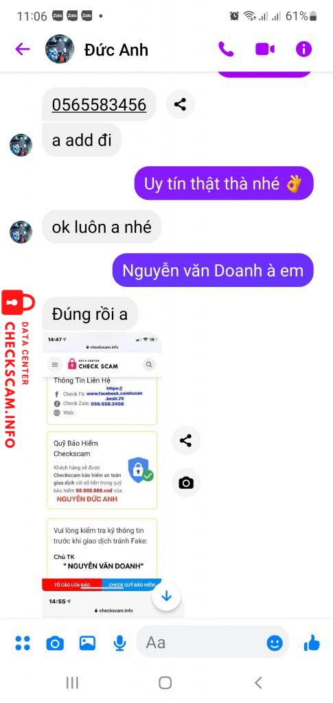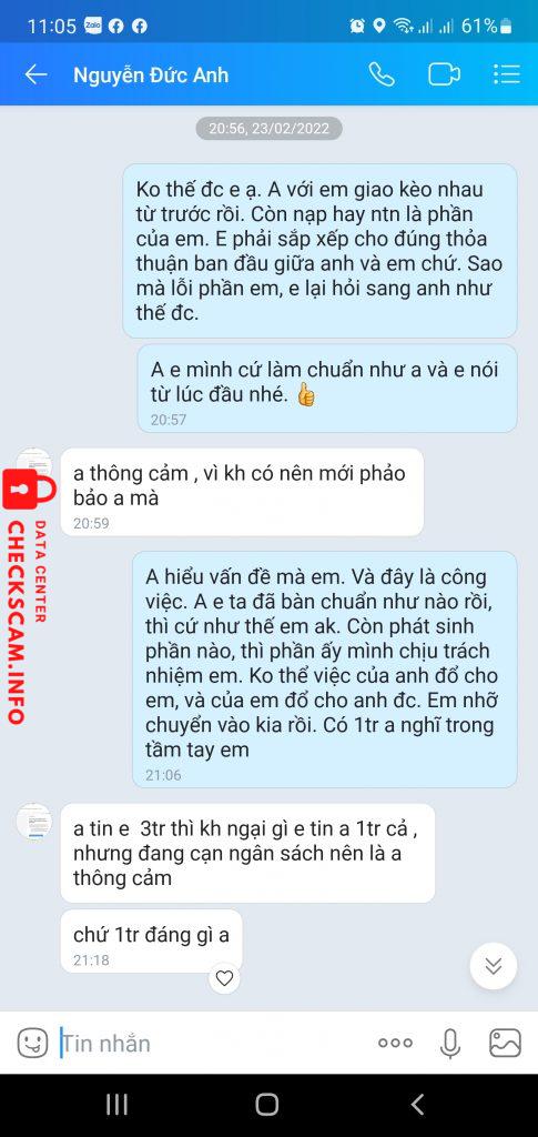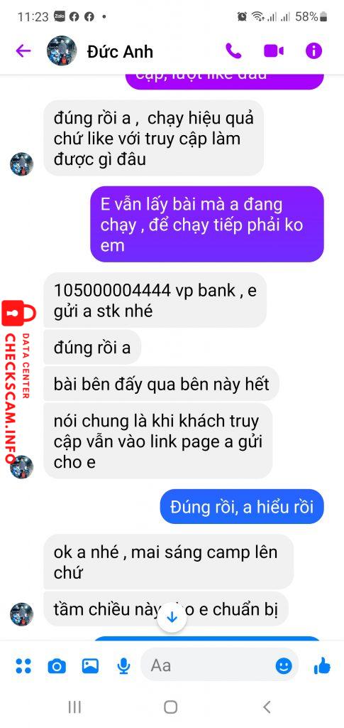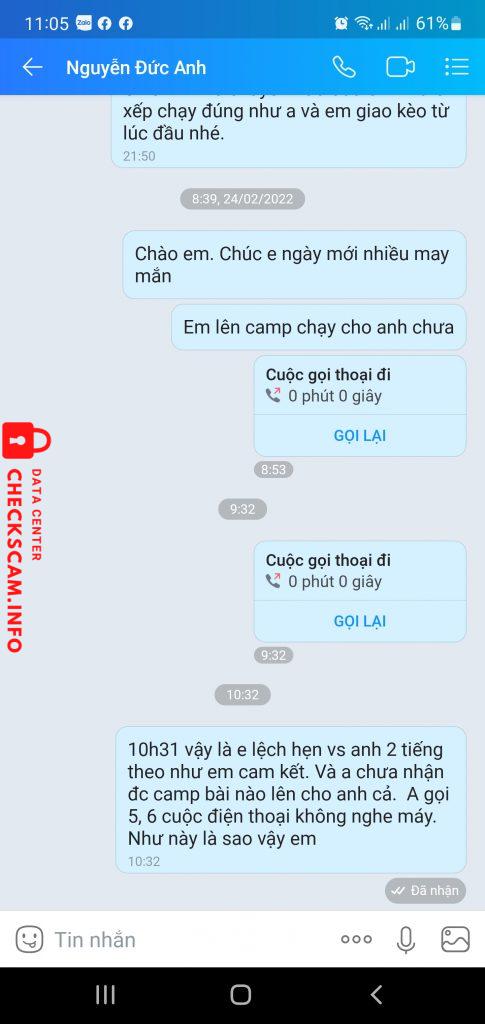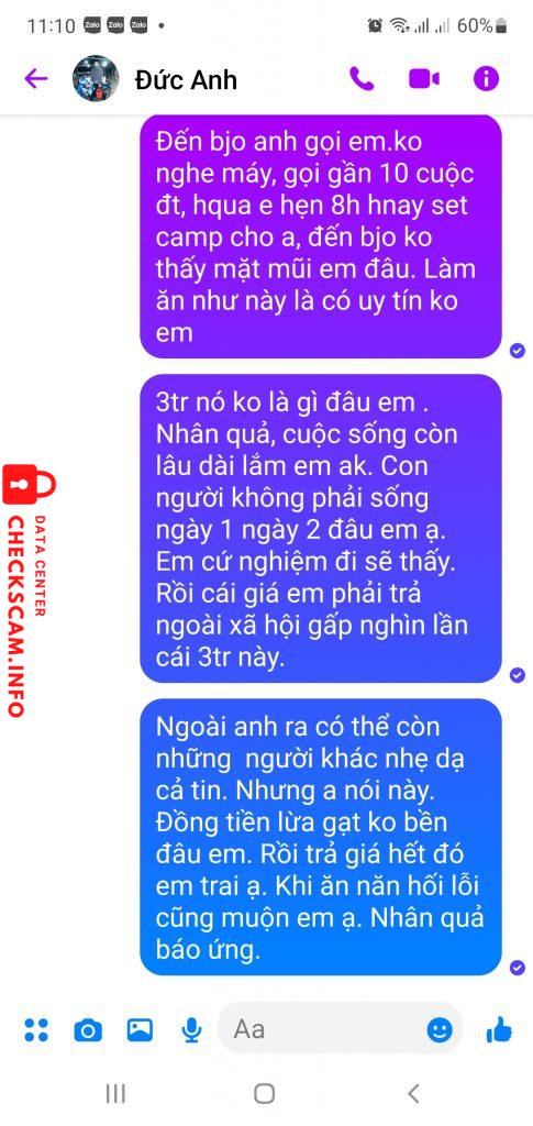 Nguyễn Đức Anh, nhận chạy Ads cho tôi với giá 7tr / tuần. Ứng trước 3tr đ chạy test trước , sau 7 ngày đúng như cam.kết thì tôi thanh toán số tiền còn lại. Như cam kết thì đúng 8h sáng ngày 24.2, Đức Anh phải lên camp bài để chạy cho tôi như thỏa thuận. Nhưng đến 11h30 phút tôi gọi rất nhiều , tầm 10 cuộc điện thoại ko thấy hồi âm. Nt cả trên FB và zalo cũng ko thấy trả lời. Vào check scam tôi mới thấy số TK của bạn này bị quá nhiều tố cáo. Rất mong admin xem xét.