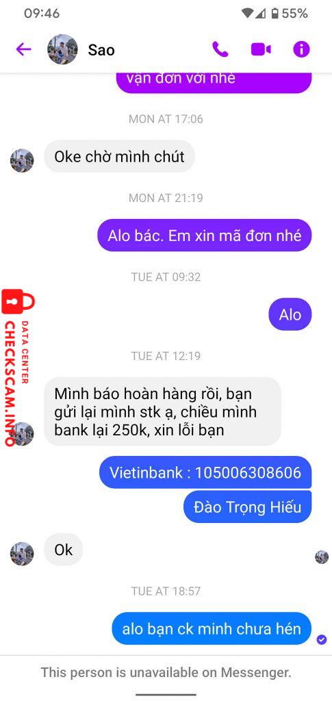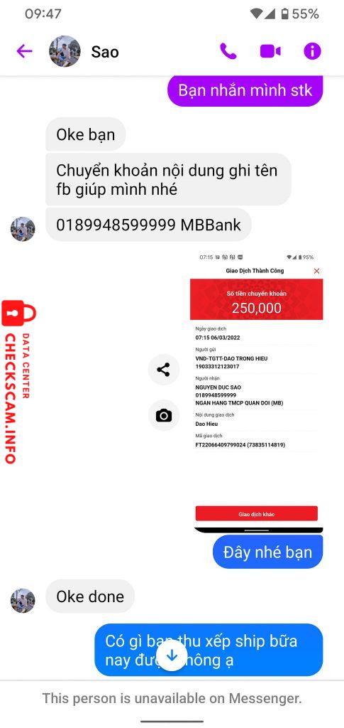 诈骗者警报: NGUYEN DUC SAO 已报告: November 16, 2024 诈骗者信息 全名: NGUYEN DUC SAO 支付网关: MB BANK 支付账户: 0189948699999 类别: 市场诈骗 来源: Checkscam 证据文件 报告描述 Lừa cọc khi đã chuyển khoản, các ngày gần đây sử dụng rất nhiều: các món hàng thấy bị lừa gần đây: Màn Dell u2419h Case Lian li 011 评论 您的评论 添加评论 暂无评论。成为第一个分享您与此诈骗者经历的人。