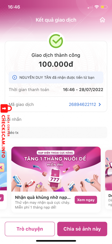 诈骗者警报: Nguyễn Duy Tân 已报告: November 16, 2024 诈骗者信息 全名: Nguyễn Duy Tân 电话号码: 0568504347 支付网关: Momo 支付账户: 0568504347 类别: 市场诈骗 来源: Checkscam 证据文件 报告描述 kéo tx bank tiền r bock 评论 您的评论 添加评论 暂无评论。成为第一个分享您与此诈骗者经历的人。