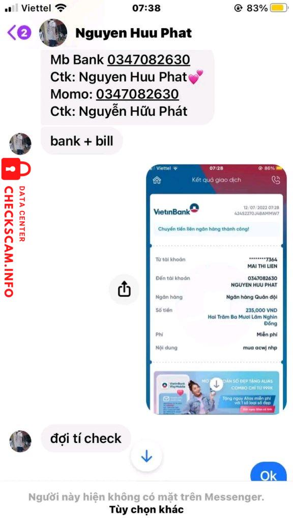诈骗者警报: NGUYEN HUU PHAT 已报告: November 16, 2024 诈骗者信息 全名: NGUYEN HUU PHAT 电话号码: 0347082630 支付网关: Mb bank 支付账户: 0347082630 类别: 市场诈骗 来源: Checkscam 证据文件 报告描述 Mua acc free fire 评论 您的评论 添加评论 暂无评论。成为第一个分享您与此诈骗者经历的人。