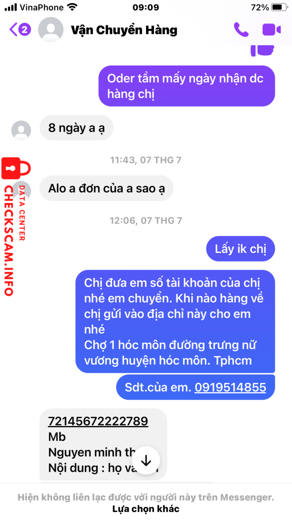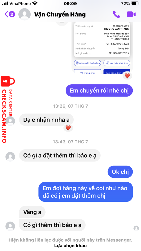 诈骗者警报: Nguyen minh thu 已报告: November 16, 2024 诈骗者信息 全名: Nguyen minh thu 支付网关: Mb 支付账户: 72145672222789 类别: 市场诈骗 来源: Checkscam 证据文件 报告描述 Em Mua hàng trên tao bao chuyển tiền xong 1 ngày sau em bị lock Facebook em mong xử lý giúp em ạ 评论 您的评论 添加评论 暂无评论。成为第一个分享您与此诈骗者经历的人。