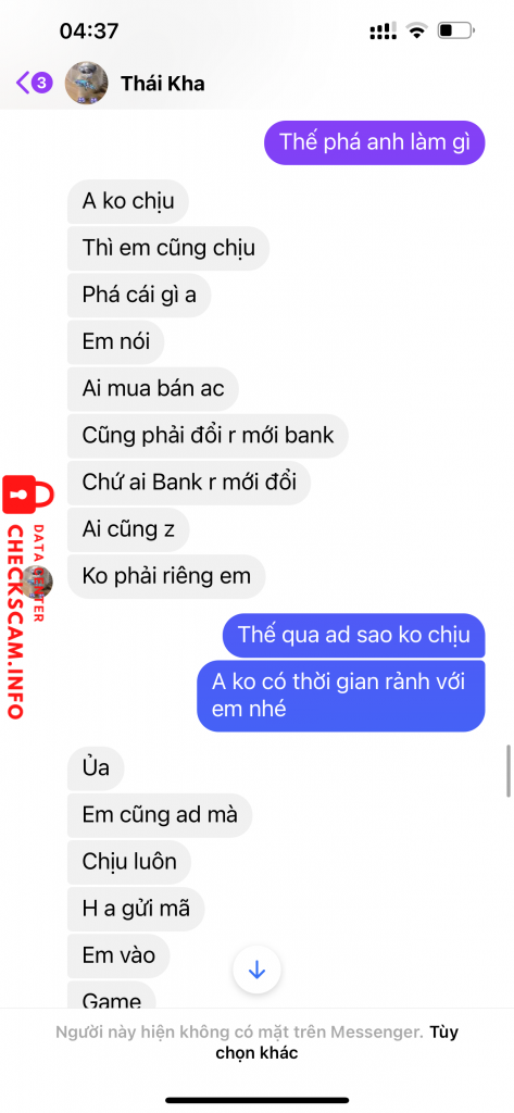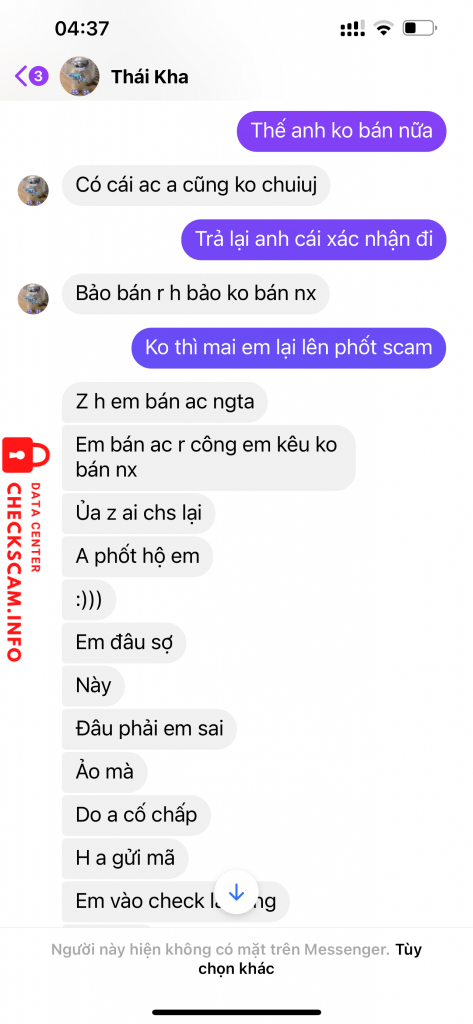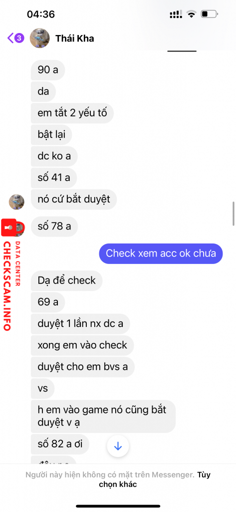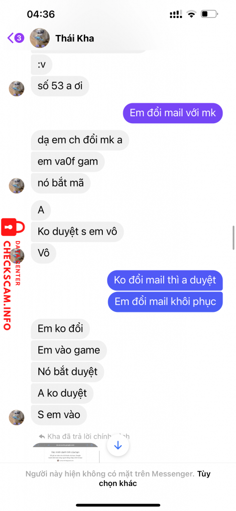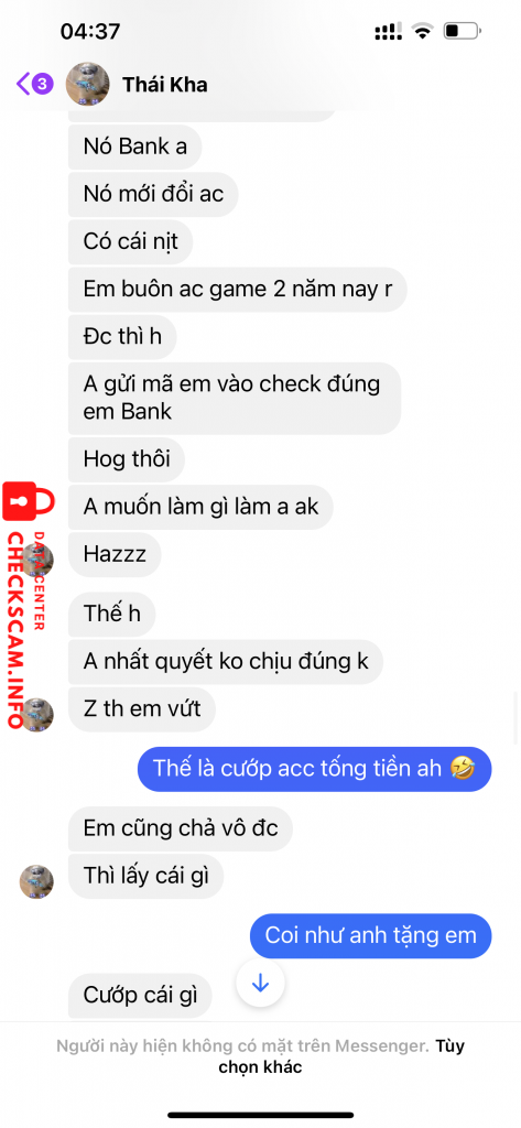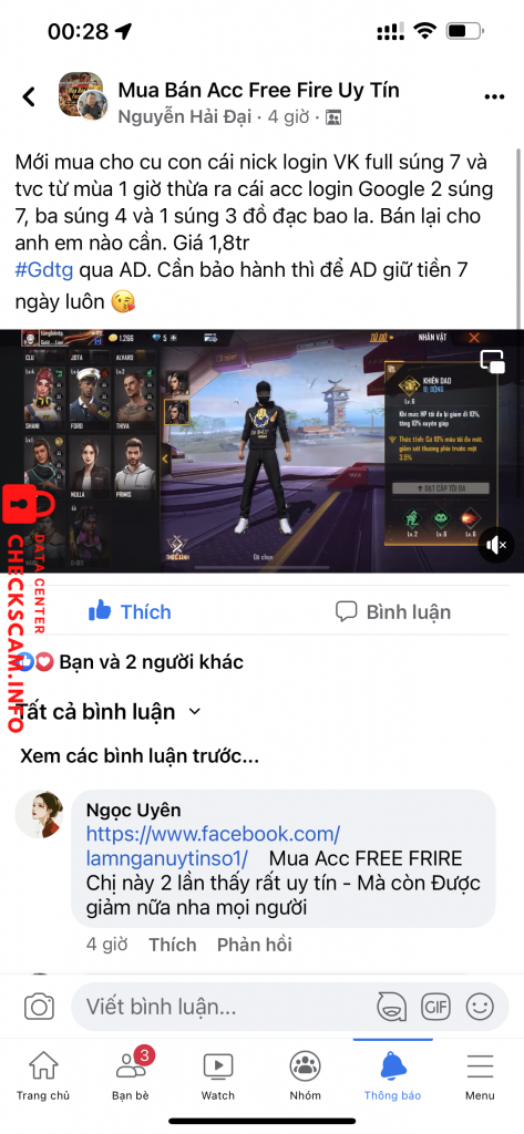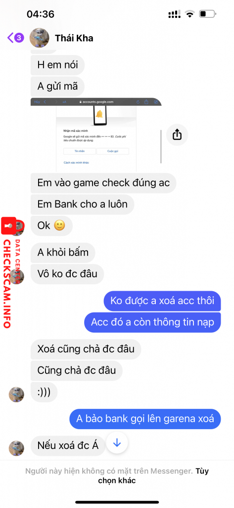 Mình có bán cái acc FF login Gg giá 1,8tr. Bạn Nguyễn Ngọc Thái Kha này có trao đổi xin mua acc và muốn check acc. Mình hơi sơ suất khi đang mải xem đá bóng đưa acc cho nó vào check. Nó vào mail đổi pass, số điện thoại xác nhận, và mail khôi phục. Mình có xác nhận đăng nhập mấy lần nhưng khi biết ý đồ nó không tốt thì nó đổi hết thông tin rồi. Hiện tại nó đăng xuất hết tài khoản và không trả lại mình acc. Đây là thông tin của nó : Nguyễn Ngọc Thái Kha .