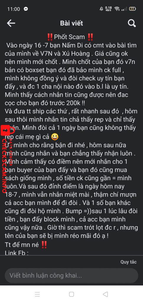 Vào ngày 16 -7 bạn Nấm Di có cmt vào bài tìm của mình về V7N và Xú Hoàng . Giá cũng ok nên mình mới chốt . Mình chốt của bạn đó v7n bản có boxset bạn đó đã bảo mình ck full , mình không đồng ý và đòi check uy tín bạn đấy , và đc 1 cha nội nào đó vào b.l là uy tín. Mình thấy cách nhắn tin cũng được nên đac cọc cho bạn đó trước 200k !!