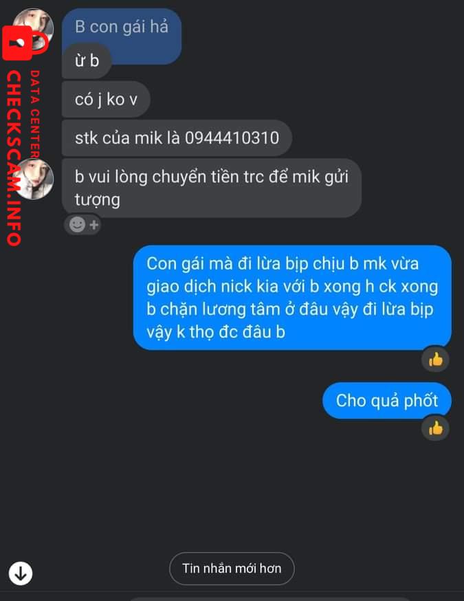 诈骗者警报: Nguyen Nhu Ha 已报告: November 16, 2024 诈骗者信息 全名: Nguyen Nhu Ha 电话号码: 0944410310 支付网关: MB Bank 支付账户: 0944410310 类别: 市场诈骗 来源: Checkscam 证据文件 报告描述 Mình mua tượng thần tài bên momo Bank tiền xong bạn đó ko cho vật phẩm Mình phốt để người khác biết và tránh giao dịch với bạn này về sau 评论 您的评论 添加评论 暂无评论。成为第一个分享您与此诈骗者经历的人。