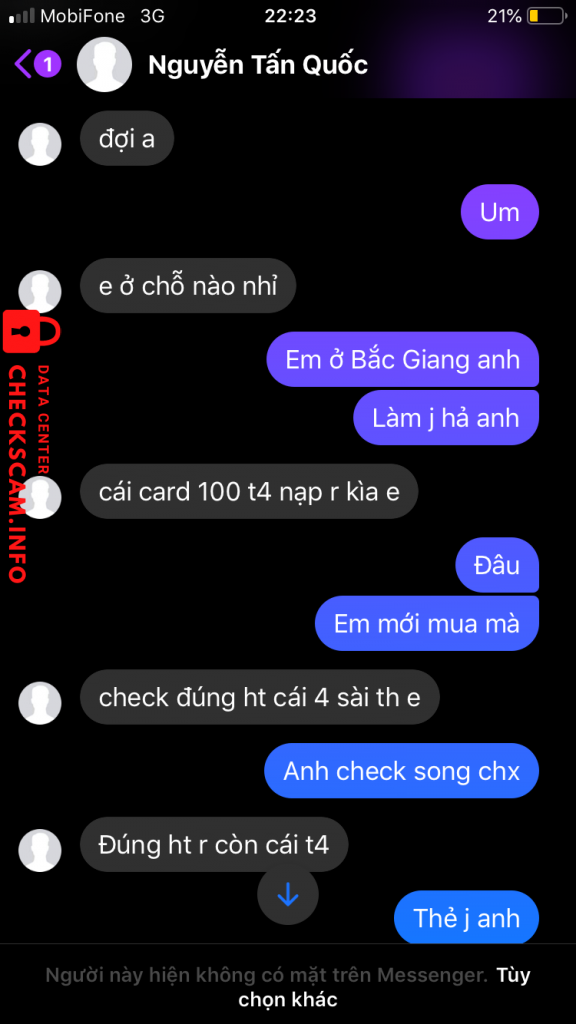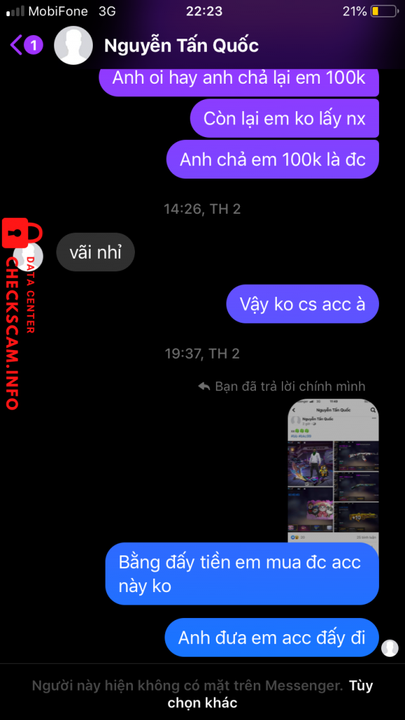 诈骗者警报: Nguyễn Tấn Quốc 已报告: November 16, 2024 诈骗者信息 全名: Nguyễn Tấn Quốc 电话号码: 0326331907 支付网关: 0326331907 支付账户: 0326331907 类别: 市场诈骗 来源: Checkscam 证据文件 报告描述 Tôi đã mua acc của anh ta nhưng mà mấy ngày anh ta ko gửi acc cho tôi rồi cs hôm anh ấy bảo anh kiếm acc khác cho nhưng qua mấy ngày ng này liền chặn tôi 评论 您的评论 添加评论 暂无评论。成为第一个分享您与此诈骗者经历的人。