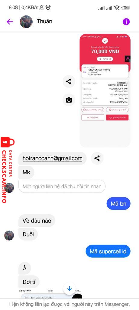 诈骗者警报: NGUYEN TAT TRUNG 已报告: November 16, 2024 诈骗者信息 全名: NGUYEN TAT TRUNG 支付网关: MB Bank 支付账户: 221220067 类别: 市场诈骗 来源: Checkscam 证据文件 报告描述 Scam 70k mua acc game bị khóa 评论 您的评论 添加评论 暂无评论。成为第一个分享您与此诈骗者经历的人。