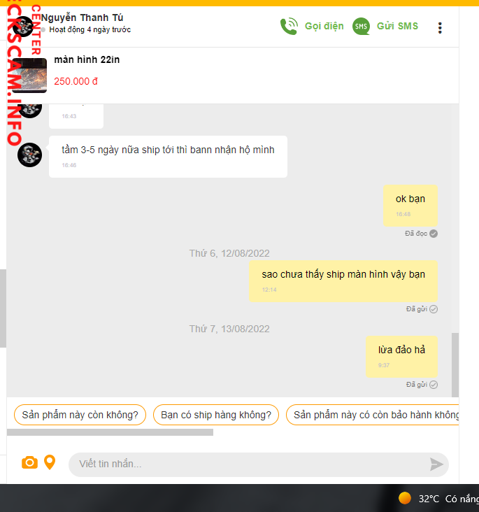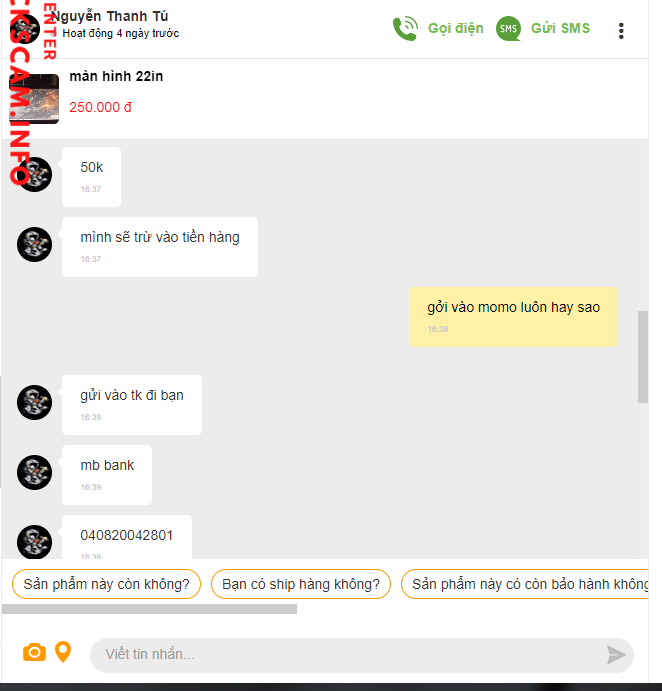 诈骗者警报: Nguyễn Thanh Tú 已报告: November 16, 2024 诈骗者信息 全名: Nguyễn Thanh Tú 电话号码: 0565626056 支付网关: MB bạn 支付账户: 040820042801 类别: 市场诈骗 来源: Checkscam 证据文件 报告描述 Nhận cọc xong không chuyển hàng, mọi người né nó nhá 评论 您的评论 添加评论 暂无评论。成为第一个分享您与此诈骗者经历的人。
