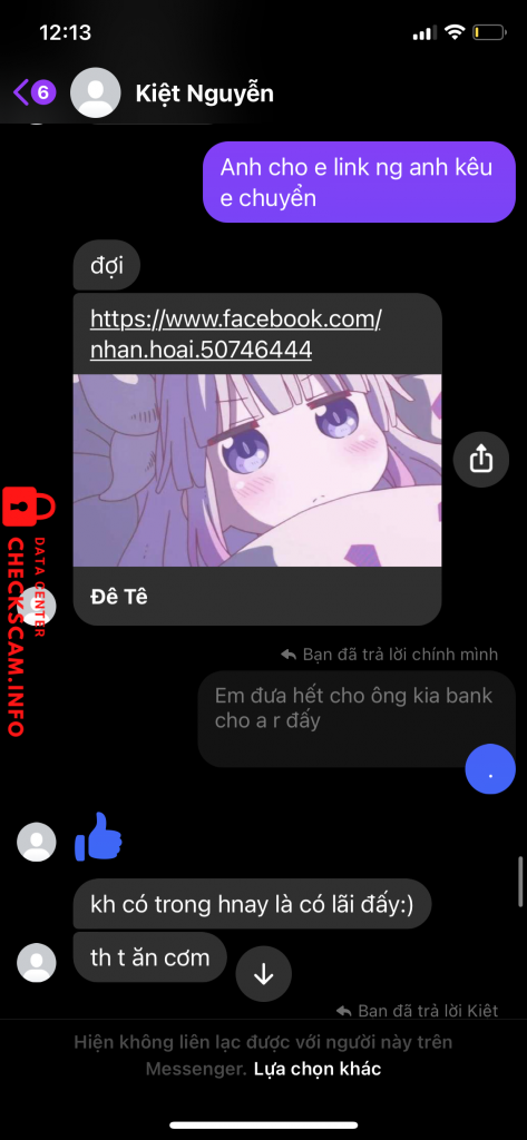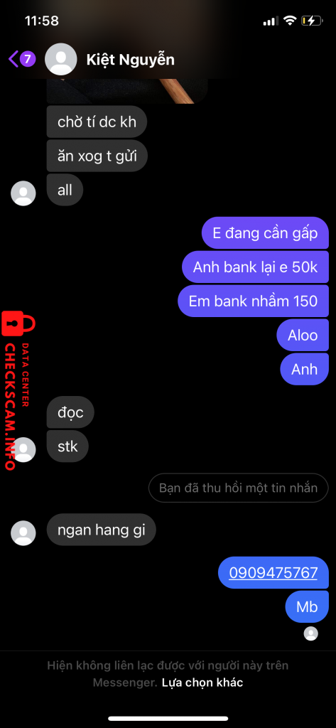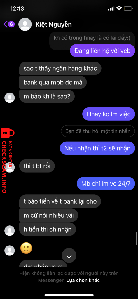 诈骗者警报: Nguyễn Thị Thu Thảo 已报告: November 16, 2024 诈骗者信息 全名: Nguyễn Thị Thu Thảo 电话号码: 0338303236 支付网关: Momo 支付账户: 0338303236 类别: 市场诈骗 来源: Checkscam 证据文件 报告描述 评论 您的评论 添加评论 暂无评论。成为第一个分享您与此诈骗者经历的人。