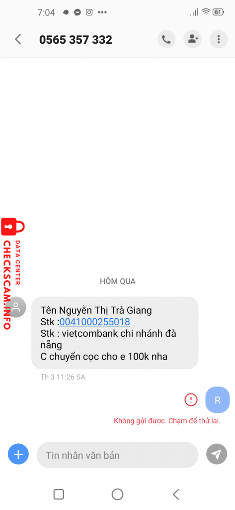 诈骗者警报: Nguyễn Thị Trà Giang 已报告: November 16, 2024 诈骗者信息 全名: Nguyễn Thị Trà Giang 电话号码: 0565357322 支付网关: Vietcombank 支付账户: 0041000255018 类别: 市场诈骗 来源: Checkscam 证据文件 报告描述 Bán hàng onl bỏ đồ rách k đúng giá nhắn thì chặn 评论 您的评论 添加评论 暂无评论。成为第一个分享您与此诈骗者经历的人。