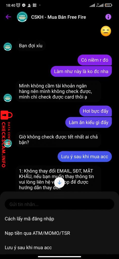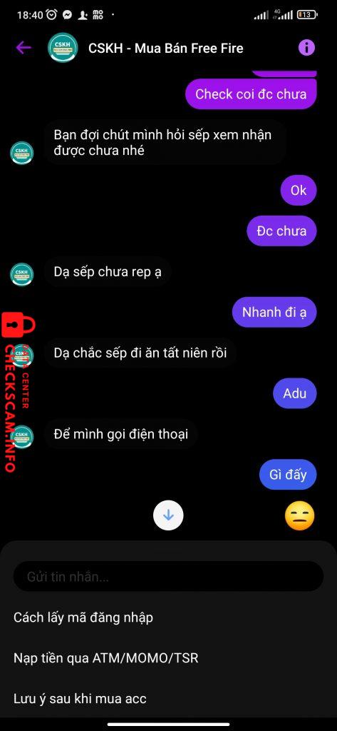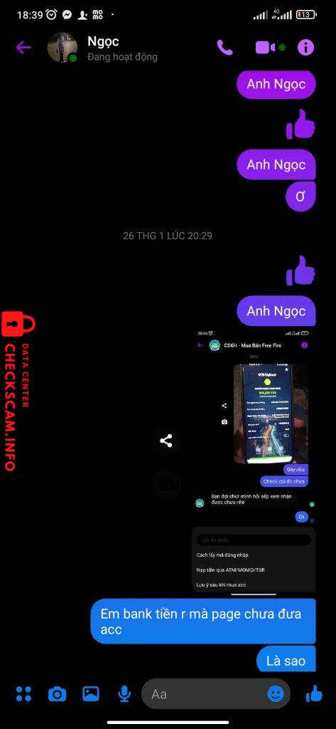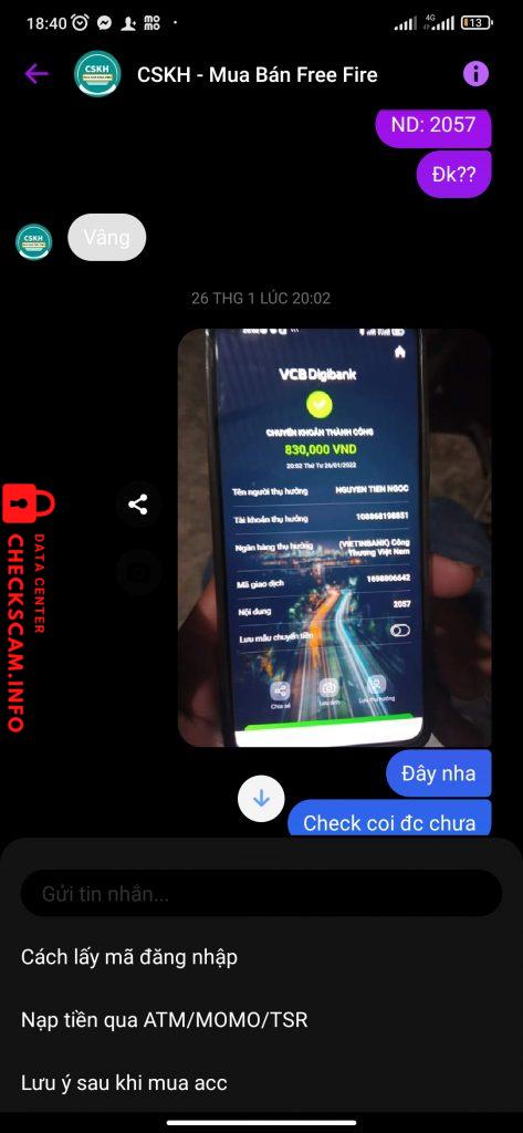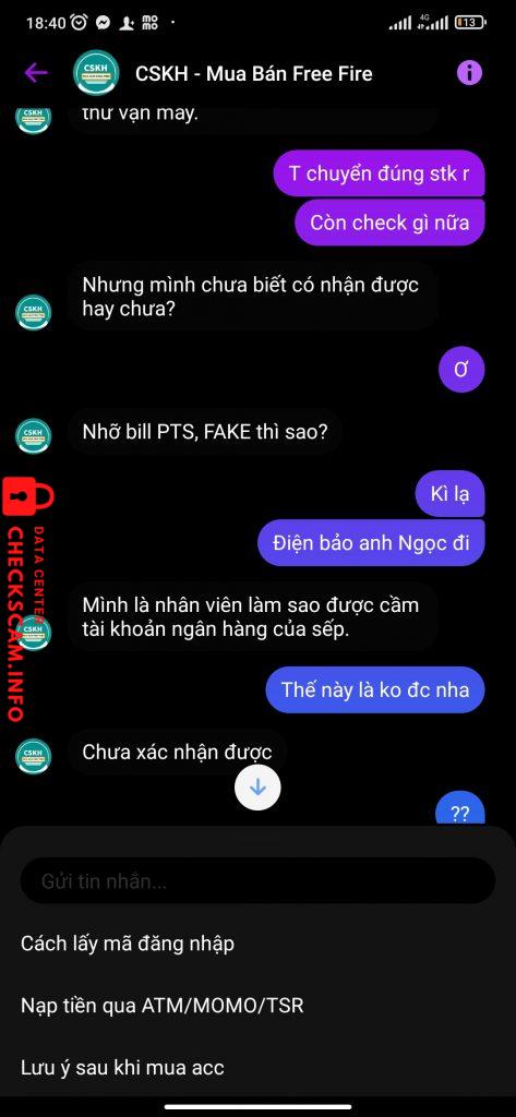 诈骗者警报: Nguyễn Tiến Ngọc 已报告: November 16, 2024 诈骗者信息 全名: Nguyễn Tiến Ngọc 支付网关: VCB Digibank 支付账户: 108868198851 类别: 市场诈骗 来源: Checkscam 证据文件 报告描述 Bank tiền qua xong, kiếm cớ chối 评论 您的评论 添加评论 暂无评论。成为第一个分享您与此诈骗者经历的人。