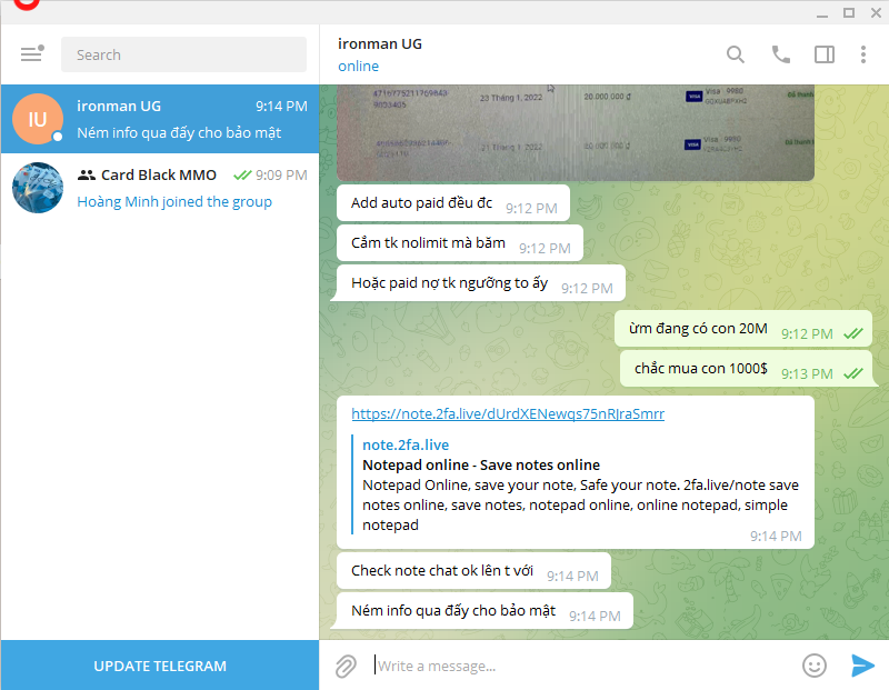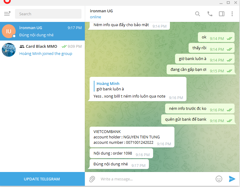 诈骗者警报: Nguyen Tien Tung 已报告: November 16, 2024 诈骗者信息 全名: Nguyen Tien Tung 支付网关: VIETCOMBANK 支付账户: 0071001242022 类别: 市场诈骗 来源: Checkscam 证据文件 报告描述 Thằng này chuyên đi scam lừa đảo bán thẻ paid nợ, mình ham rẻ với chủ quan nên bank cho nó luôn, bank xong nó chặn thông tin của mình luôn, ae chú ý tránh xa nó ra nhé 评论 您的评论 添加评论 暂无评论。成为第一个分享您与此诈骗者经历的人。
