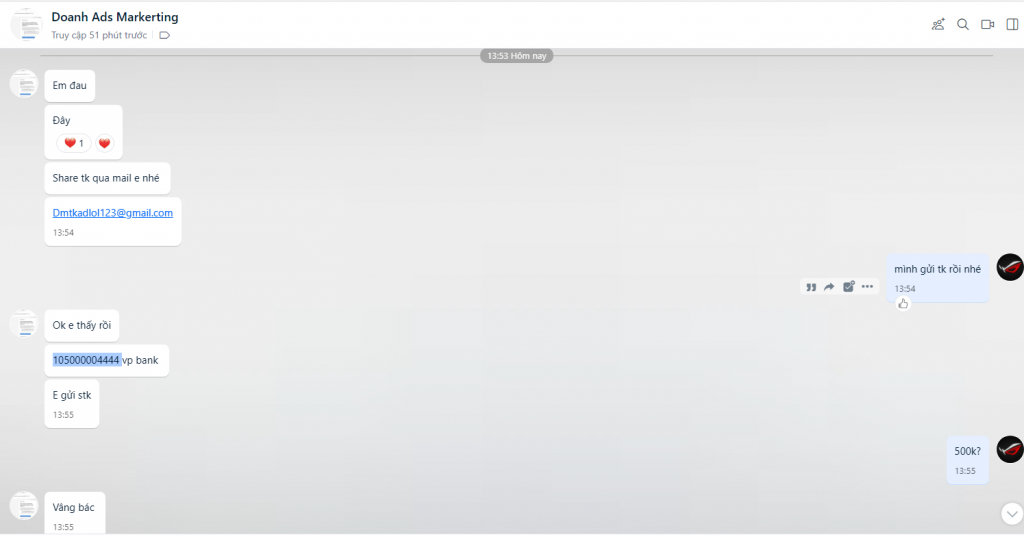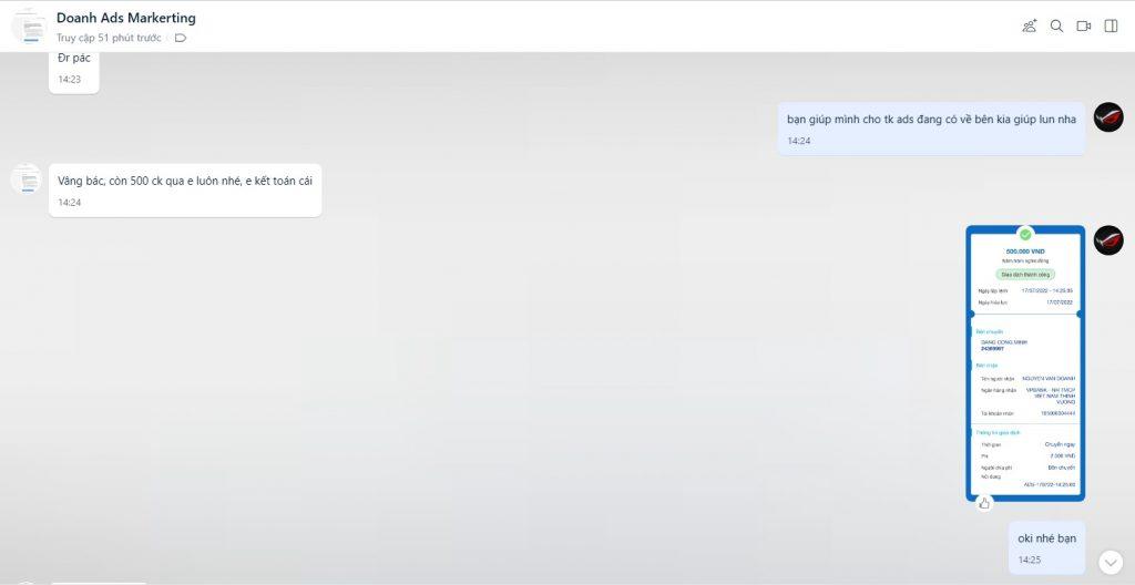 Thủ Đoạn : Nhận Chạy ADS Giá 500k sau đó hỏi TK có gd chưa, Mình nói chưa thì người nàynoi1 mua lun tk ads bên này đã setup sẵn