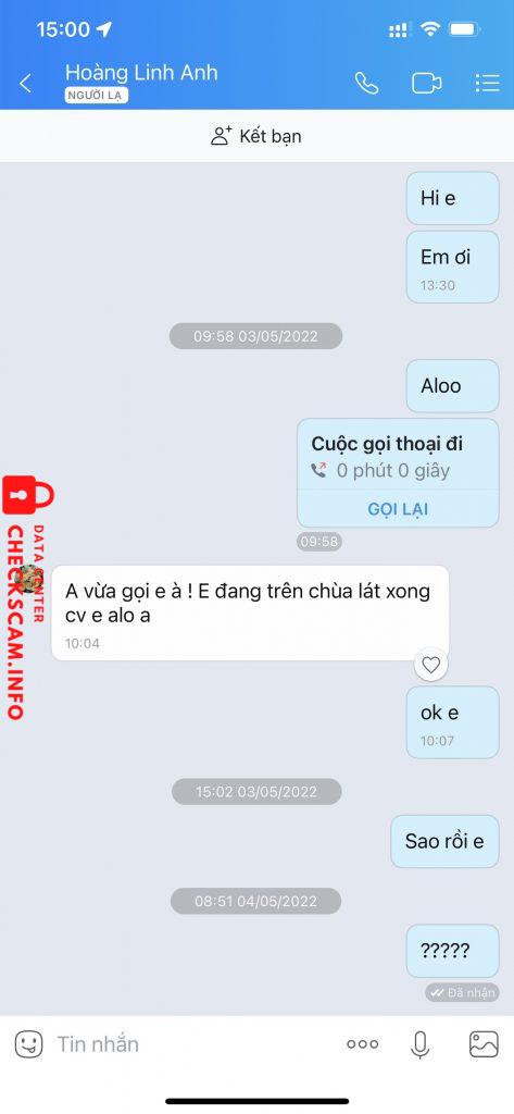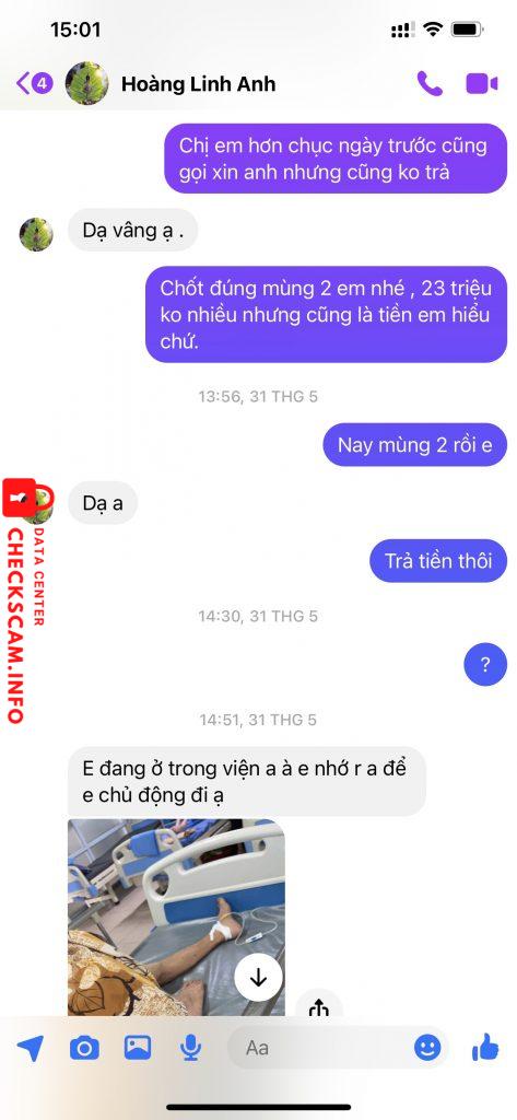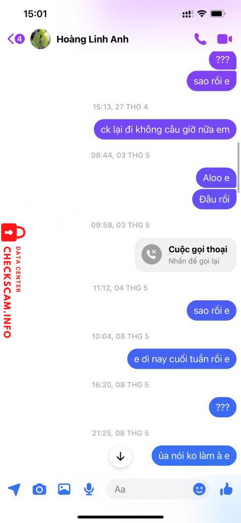 tất cả mọi cuộc trao đổi, zalo , mes , mình đều ghi lại làm bằng chứng, hiện tại hoàng linh anh còn cầm của mình 20 triệu không trả, mình đang làm đơn gửi lên công an TP Thái Nguyên .