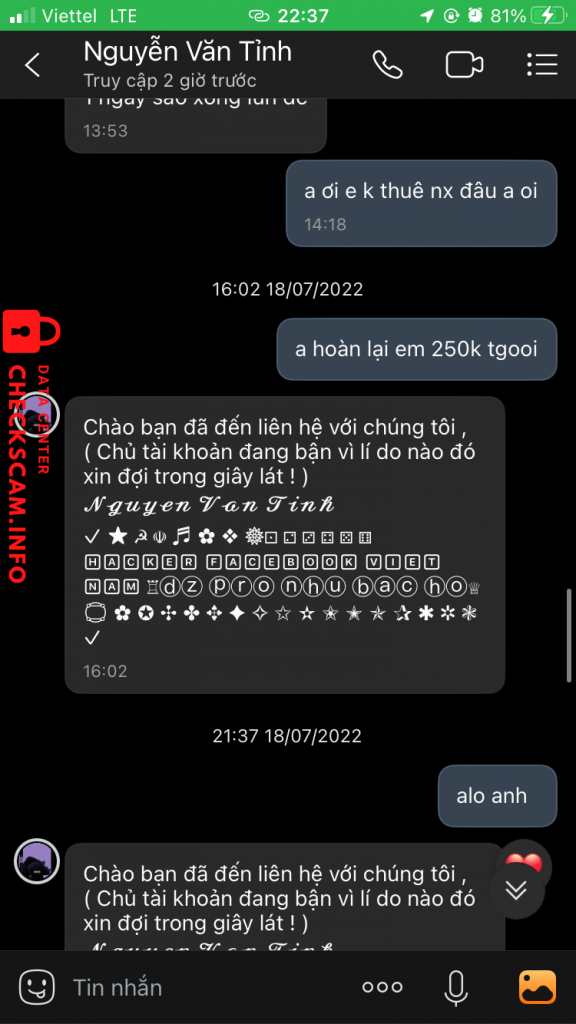 ACC TÔI BỊ KHOÁ VÀ TÔI CÓ NHỜ ANH TỈNH NÀY MỞ KHOÁ, 2-3 HÔM ANH TA KHÔNG ĐỘNG GÌ ĐẾN ACC THÌ TÔI NHẮC ANH CỨ NÓI OK NÀY KIA R BẢO KHÔNG THUÊ NỮA HOÀN LẠI 250 THÌ KHÔNG REP MAI SAU BẢO HOÀN THÌ TRƯA ANH BANK VÀ GIỜ ANH BANK MÀ KHÔNG THẤY GÌ ĐÒI 1-2 HÔM NAY XEM KHÔNG THÈM TRẢ LỜI