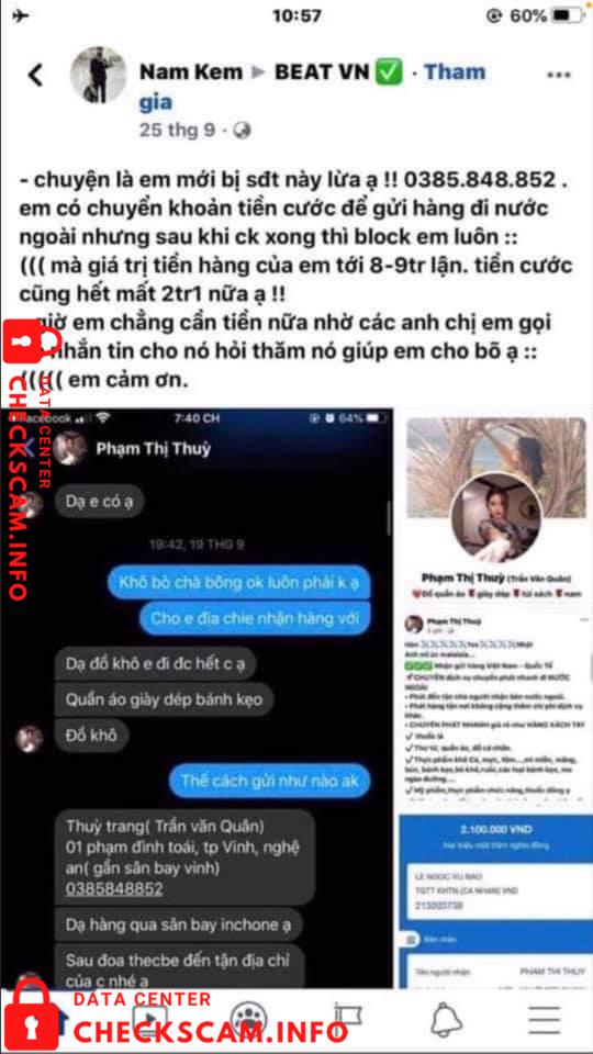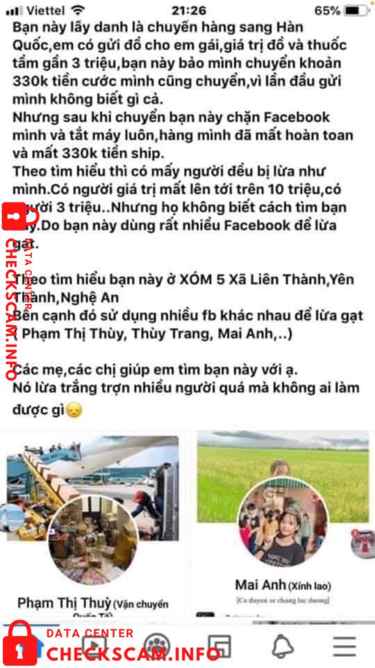 Xin add ghim bài viết của mình lên đầu trang được không ạ. Hiện giờ có rất nhiều bạn đang bị 1 nick face có tên là Phạm Thị Thuỳ lừa đảo gửi đồ. Nó dùng rất nhiều nick ảo nhưng lúc nào cũng lấy cái tên đấy để sử dụng chuyển tiền vào tài khoản nó chỉ thay đổi hình đại diện thôi ạ. Để tránh mọi người tiếp tục bị lừa những ai đã và đang từng gửi đồ cho nó nhảy vào cmt để mọi người đọc được mà tránh ạ. Bức xúc với con này mà k làm gì được nó