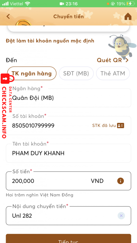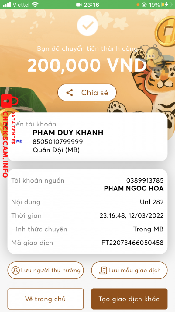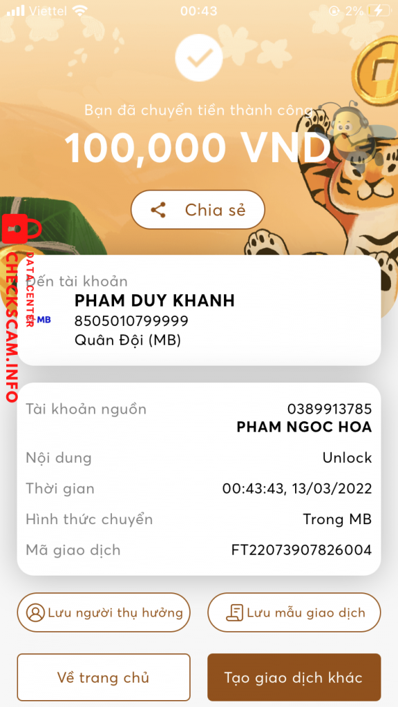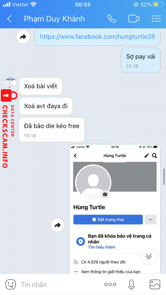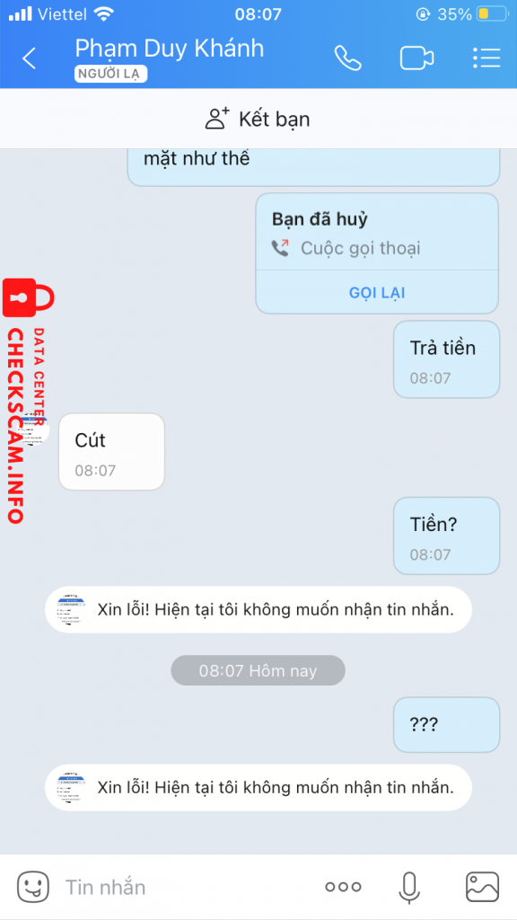 诈骗者警报: Phạm Duy Khánh 已报告: November 16, 2024 诈骗者信息 全名: Phạm Duy Khánh 电话号码: 0986252947 支付网关: MBBank 支付账户: 8505010799999 类别: 市场诈骗 来源: Checkscam 证据文件 报告描述 Bạn này kêu giúp mình lấy lại fb, sau đó nhận được tiền rồi block mình luôn 评论 您的评论 添加评论 暂无评论。成为第一个分享您与此诈骗者经历的人。