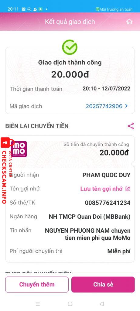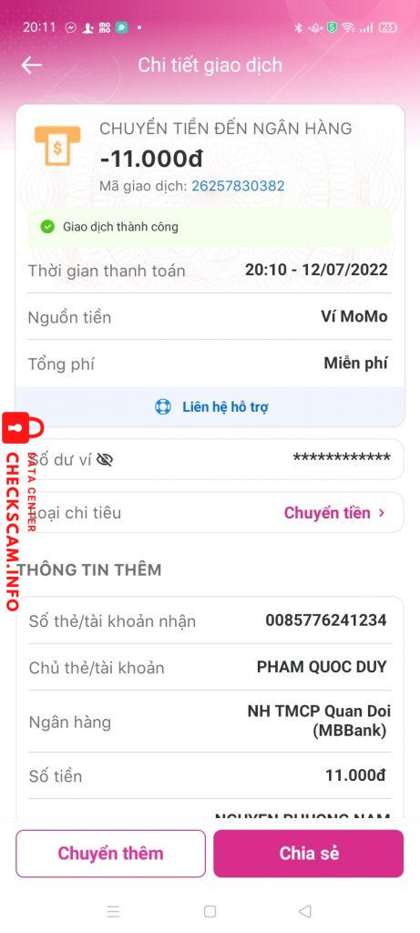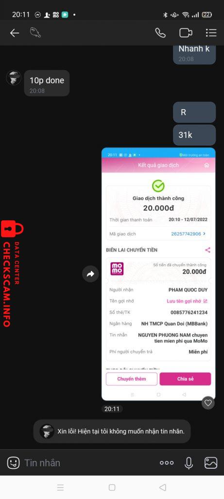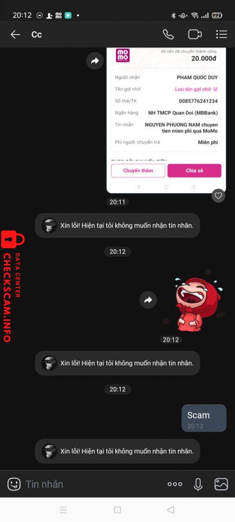 诈骗者警报: Pham Quoc Duy 已报告: November 16, 2024 诈骗者信息 全名: Pham Quoc Duy 电话号码: 0085776241234 支付网关: Mbank 支付账户: 0085776241234 类别: 市场诈骗 来源: Checkscam 证据文件 报告描述 Thanh niên đói nhất năm scam 31k-))) 评论 您的评论 添加评论 暂无评论。成为第一个分享您与此诈骗者经历的人。