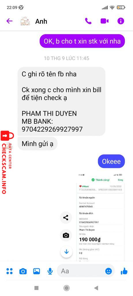 诈骗者警报: Pham Thi Duyen 已报告: November 16, 2024 诈骗者信息 全名: Pham Thi Duyen 支付网关: MBbank 支付账户: 9704229269927997 类别: 市场诈骗 来源: Checkscam 证据文件 报告描述 Lừa đảo, chiếm đoạt tài sản, scam tiền 评论 您的评论 添加评论 暂无评论。成为第一个分享您与此诈骗者经历的人。