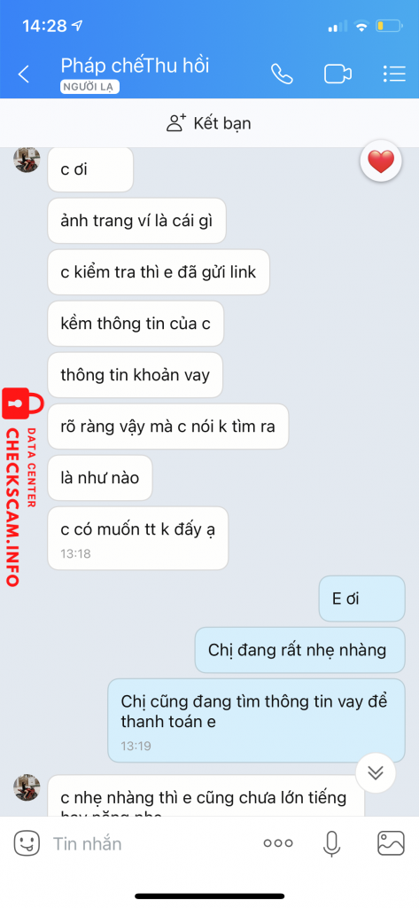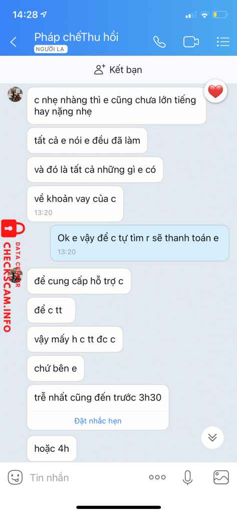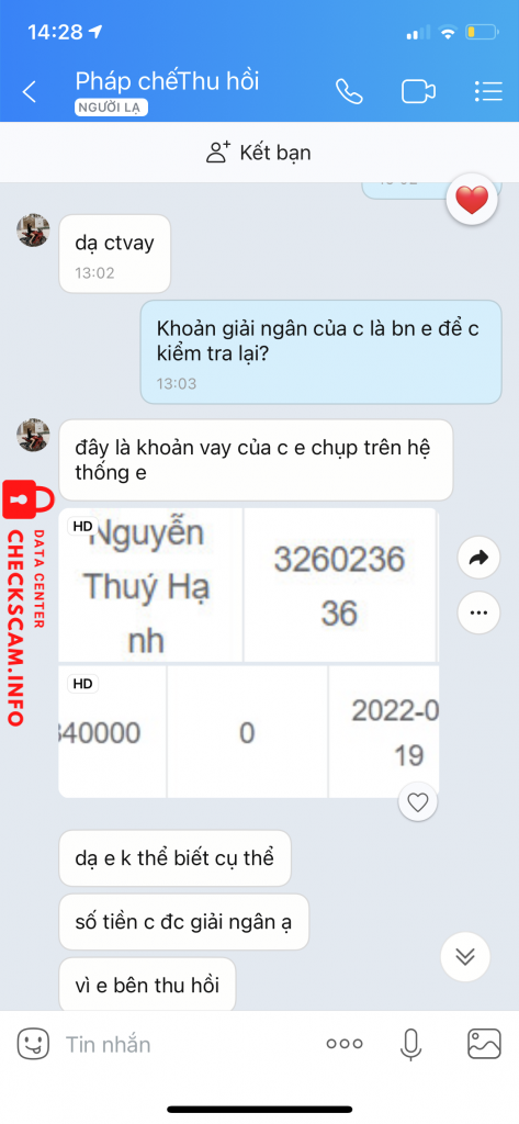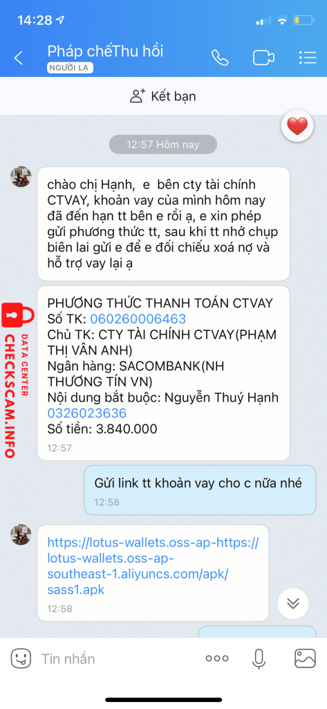 Chào mọi người mình có vay tiền online và để thông tin ở nhiều app và đã bị đối tượng này lợi dụng định lừa đảo mình. Con này nhắn tin có khoản vay đến hạn trong khi mình vay đâu mình nhớ và check lại cẩn thận. Mình kiểm tra đi kiểm tra lại trong tài khoản không hề có khoản nào giải ngân như thế. Nên lúc đó mình chắc 80% con này lừa rồi. Đã thế còn cho số tài khoản là cá nhân nên càng nghi ngờ. Tuy nhiên con này lại doạ sẽ gây khó dễ và ảnh hưởng đến cuộc sống của mình nên cũng hơi hoang mang vì mình chưa ct cho nó. Lên google thì search ra 1 chị cũng bị lừa như nó và có đăng trong này. Ae cẩn thận