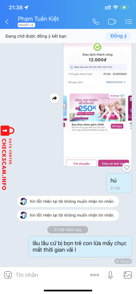 诈骗者警报: Phạm Tuấn Kiệt 已报告: November 16, 2024 诈骗者信息 全名: Phạm Tuấn Kiệt 电话号码: 0921778077 支付网关: Momo 支付账户: 0921778077 类别: 市场诈骗 来源: Checkscam 证据文件 报告描述 bán hotmail :))) 评论 您的评论 添加评论 暂无评论。成为第一个分享您与此诈骗者经历的人。