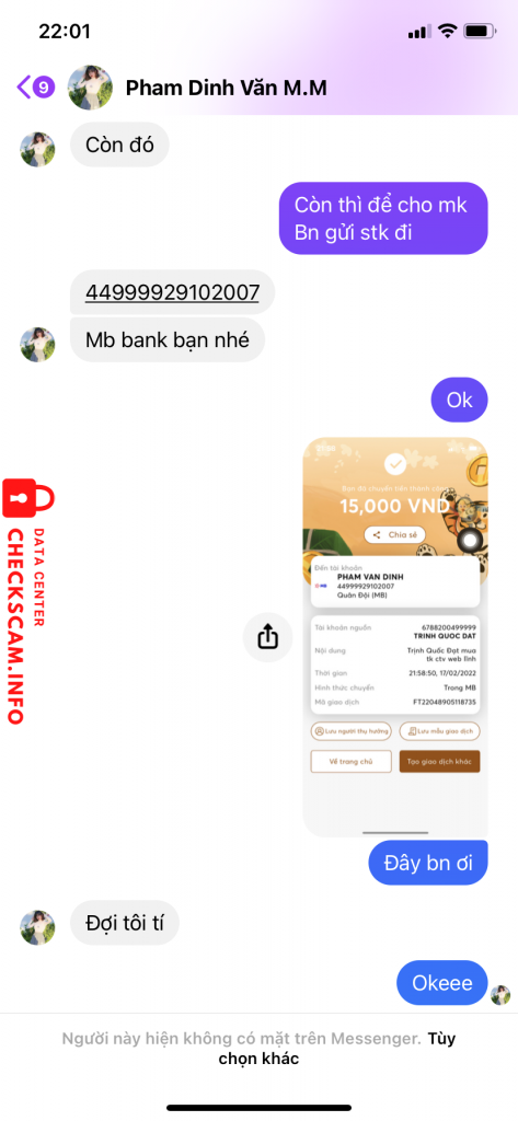 诈骗者警报: Pham Van Dinh 已报告: November 16, 2024 诈骗者信息 全名: Pham Van Dinh 支付网关: MB BANK 支付账户: 44999929102007 类别: 市场诈骗 来源: Checkscam 证据文件 报告描述 Tôi đã bị bạn này lừa 评论 您的评论 添加评论 暂无评论。成为第一个分享您与此诈骗者经历的人。