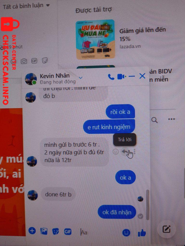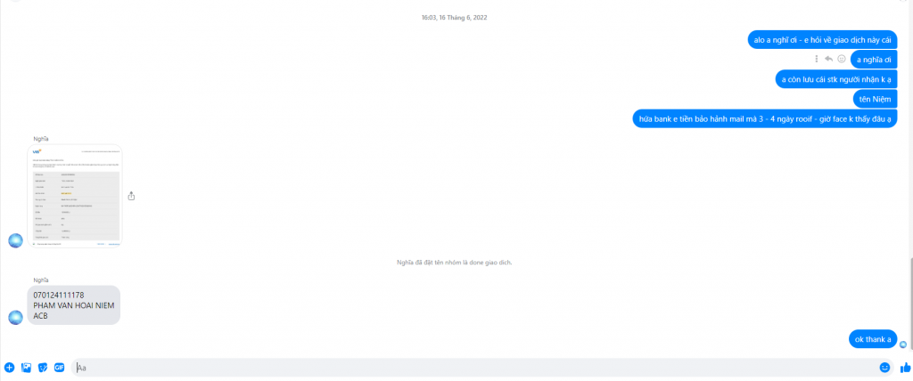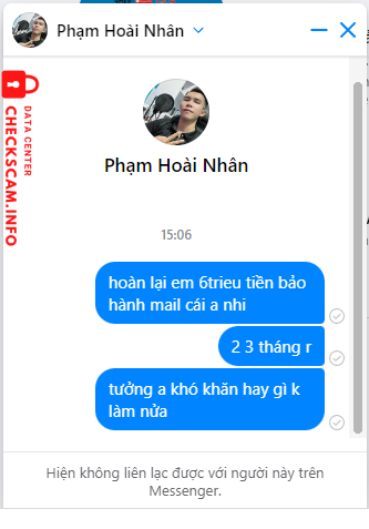 Em mua mail tổng giá trị 19trieu – từ tháng 6 trung gian qua a Nghĩa có bill ck của a nghĩa qua tk người đó- sau đó mail bị lổi bên bán có bảo hoàn 12trieu – Sau đó hoàn 6 triệu vì không đủ tiền.Vài ngày sau thì xóa facebook chặn em – e có liên lạc đều bị chặn. Sau đó a kia tạo facebook mới với tên là Phạm Hoài Nhân ( link: https://www.facebook.com/Nhankiller/ ) – Em có nhắn tin vào thì bị chặn.Số điện thoại gọi vài lần cũng bị chặn.Zalo tele đọc k rep.
