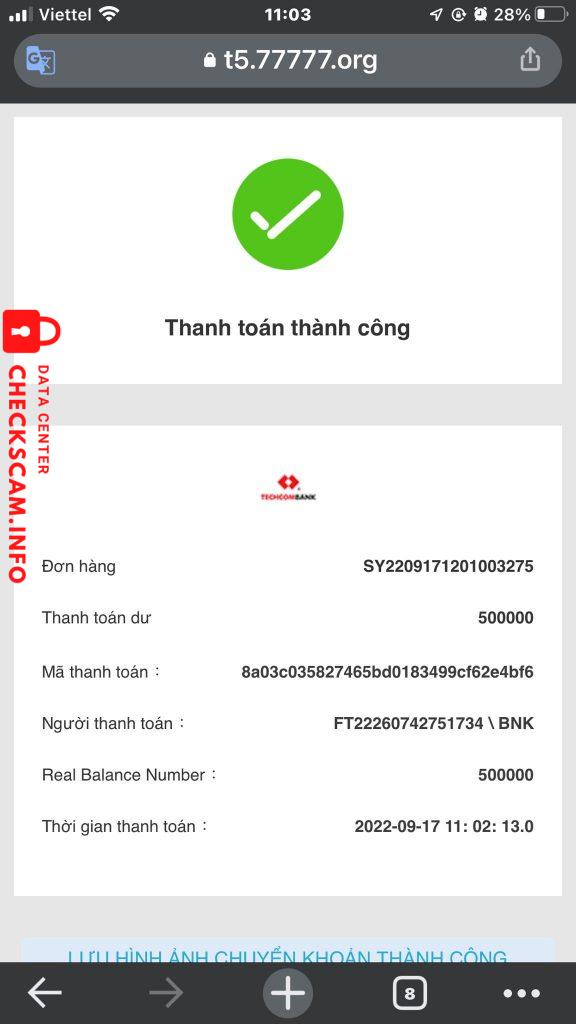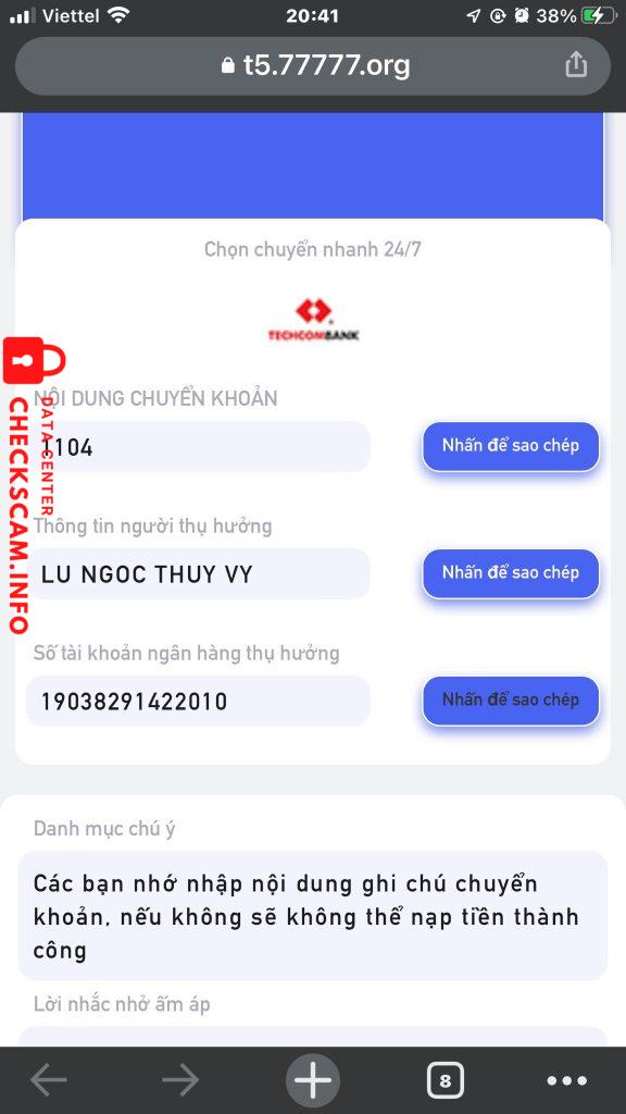 诈骗者警报: t5.77777.org – LU NGOC THUY VY 已报告: November 16, 2024 诈骗者信息 全名: t5.77777.org – LU NGOC THUY VY 电话号码: 0348858403 支付网关: TECHCOMBANK 支付账户: 19038291422010 类别: 市场诈骗 来源: Checkscam 证据文件 报告描述 chiếm đoạt tài sản với hành vi tinh vi và qua mạng xã hội với đường Link: 评论 您的评论 添加评论 暂无评论。成为第一个分享您与此诈骗者经历的人。