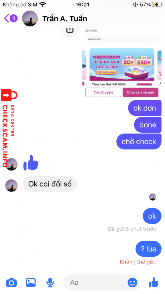 诈骗者警报: TRẦN ANH TUẤN 已报告: November 16, 2024 诈骗者信息 全名: TRẦN ANH TUẤN 电话号码: 0358772130 支付网关: Momo 支付账户: 0358772130 类别: 市场诈骗 来源: Checkscam 证据文件 报告描述 scam 800k acc liên quân 评论 您的评论 添加评论 暂无评论。成为第一个分享您与此诈骗者经历的人。
