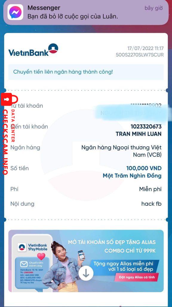 诈骗者警报: Trần Minh Luân 已报告: November 16, 2024 诈骗者信息 全名: Trần Minh Luân 支付网关: Vietcombank 支付账户: 1023320673 类别: 市场诈骗 来源: Checkscam 证据文件 报告描述 Scam lừa đảo,chuyển tiền rồi đe doạ ngược lại 评论 您的评论 添加评论 暂无评论。成为第一个分享您与此诈骗者经历的人。