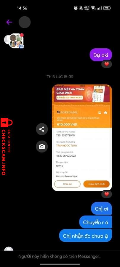 诈骗者警报: TRAN NGOC TUAN 已报告: November 16, 2024 诈骗者信息 全名: TRAN NGOC TUAN 支付网关: Agribank 支付账户: 7301205078949 类别: 市场诈骗 来源: Checkscam 证据文件 报告描述 Sì cam mấy người luôn rồi đó ạ :((( 评论 您的评论 添加评论 暂无评论。成为第一个分享您与此诈骗者经历的人。