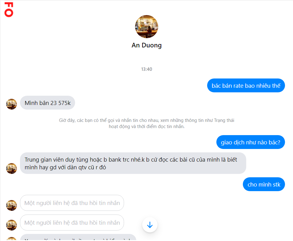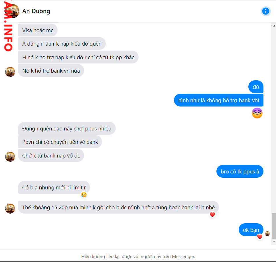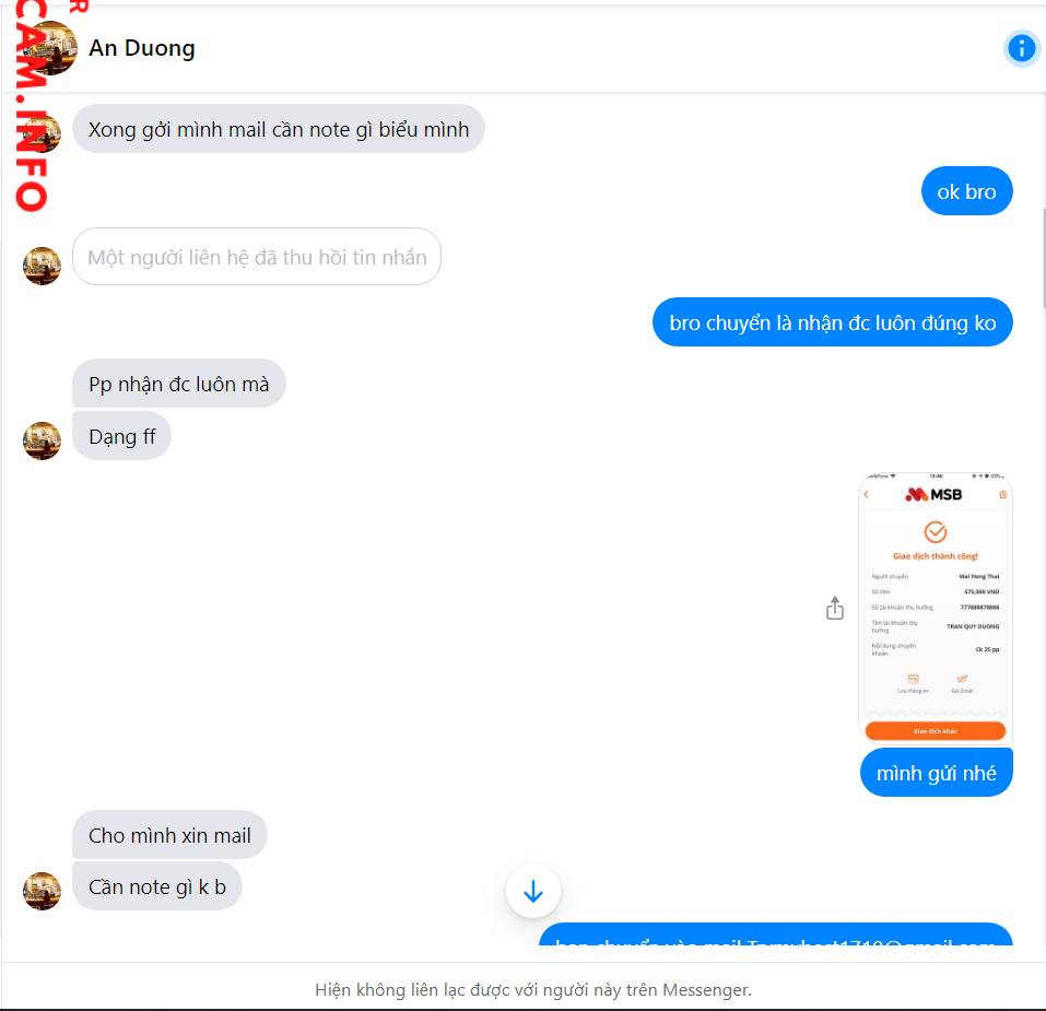 诈骗者警报: Tran Quy Duong 已报告: November 16, 2024 诈骗者信息 全名: Tran Quy Duong 支付网关: MB Bank 支付账户: 777888878886 类别: 市场诈骗 来源: Checkscam 证据文件 报告描述 Lừa đảo bằng hình thức chuyển tiền PayPal 评论 您的评论 添加评论 暂无评论。成为第一个分享您与此诈骗者经历的人。