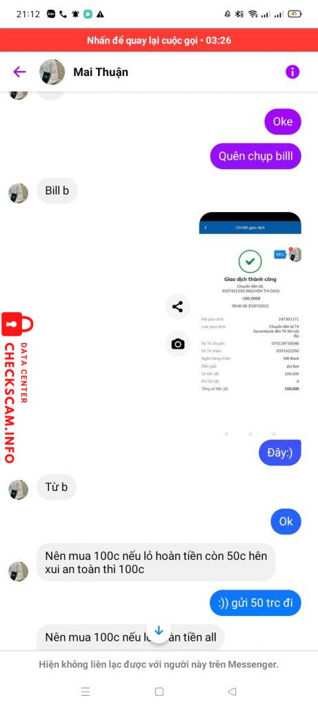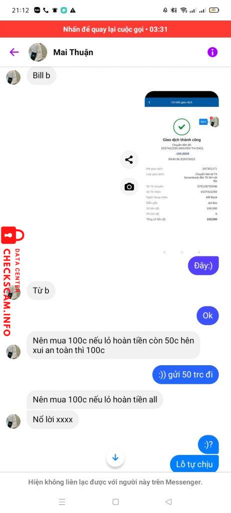 诈骗者警报: Trần Thị Đào 已报告: November 16, 2024 诈骗者信息 全名: Trần Thị Đào 电话号码: 0337422250 支付网关: Mb bank 支付账户: 0337422250 类别: 市场诈骗 来源: Checkscam 证据文件 报告描述 Scam 评论 您的评论 添加评论 暂无评论。成为第一个分享您与此诈骗者经历的人。