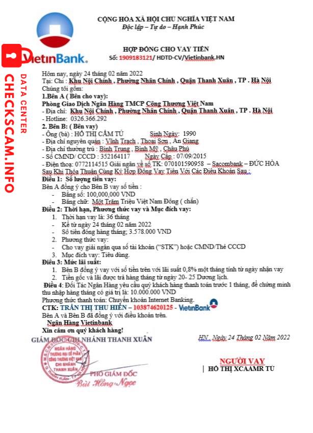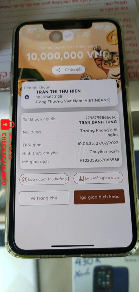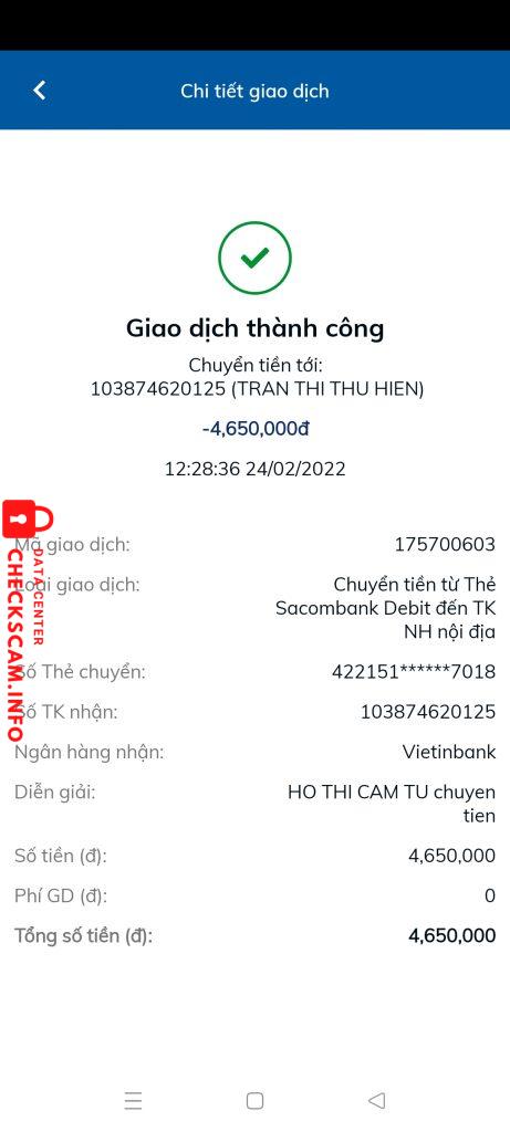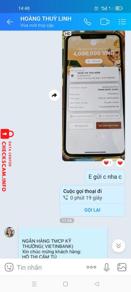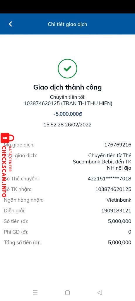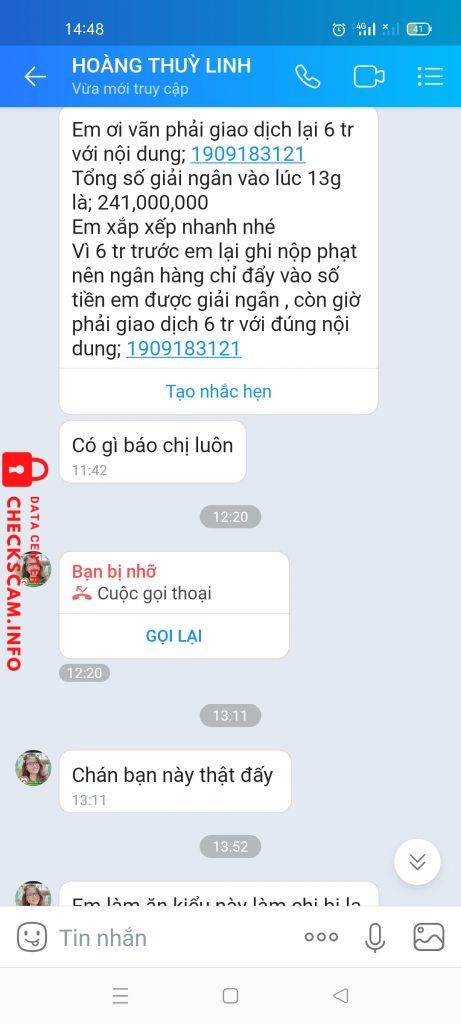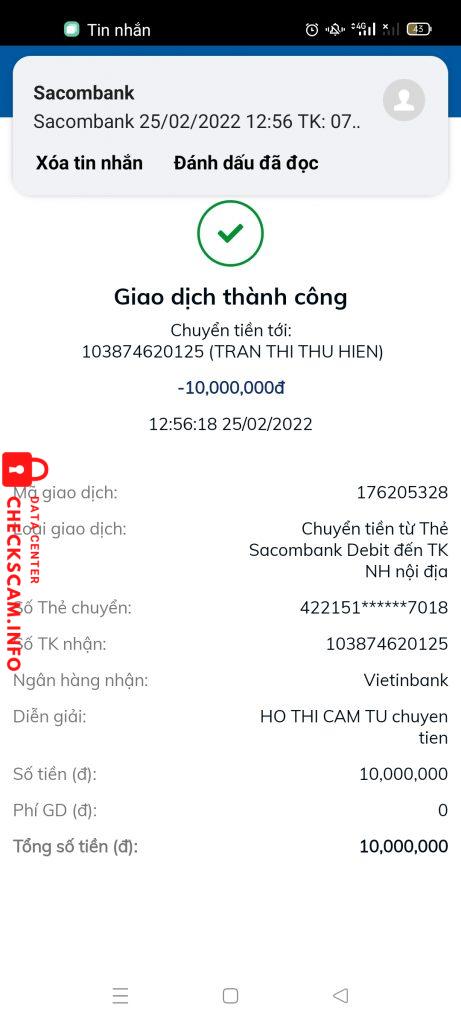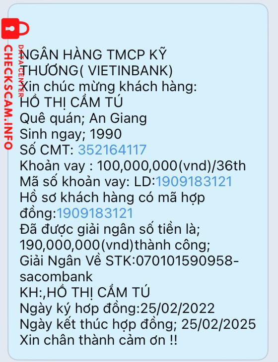 诈骗者警报: Trần Thị Thu Hiền 已报告: November 16, 2024 诈骗者信息 全名: Trần Thị Thu Hiền 电话号码: 0962098372 支付网关: Vietinbank 支付账户: 103874620125 类别: 市场诈骗 来源: Checkscam 证据文件 报告描述 Lừa đảo chiếm đoạt tài sản, cho vay vốn ngân hàng Vietinbank. Lừa số tiền hơn 150 triệu đồng. 评论 您的评论 添加评论 暂无评论。成为第一个分享您与此诈骗者经历的人。