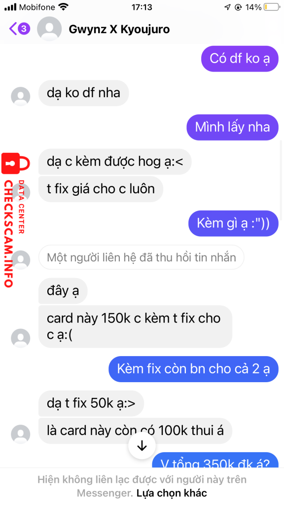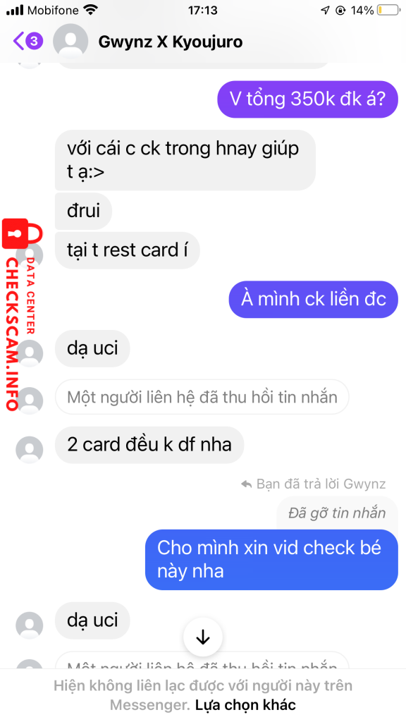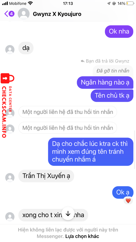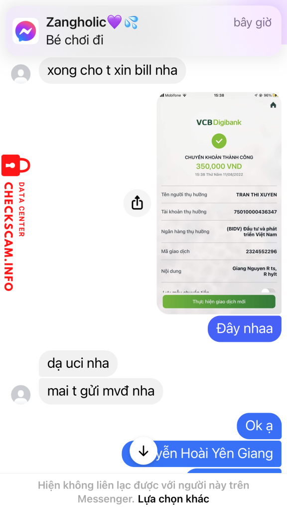 诈骗者警报: Trần Thị Xuyến 已报告: November 16, 2024 诈骗者信息 全名: Trần Thị Xuyến 支付网关: BIDV 支付账户: 75010000436347 类别: 市场诈骗 来源: Checkscam 证据文件 报告描述 Scammer card Blackpink nha 评论 您的评论 添加评论 暂无评论。成为第一个分享您与此诈骗者经历的人。