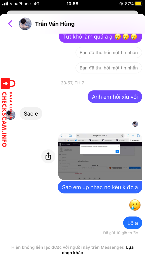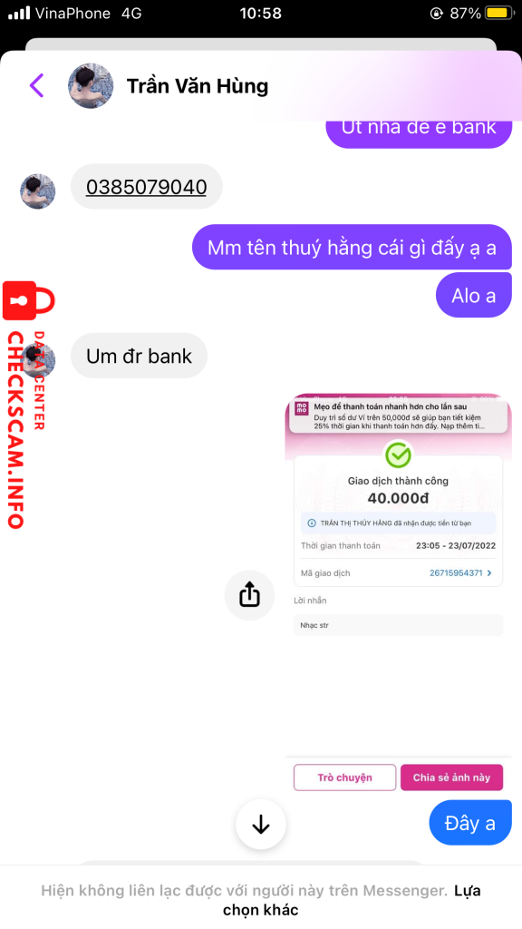 诈骗者警报: Trần Văn Hùng 已报告: November 16, 2024 诈骗者信息 全名: Trần Văn Hùng 电话号码: 0385079040 社交媒体链接: https://www.facebook.com/SADBOIZ.888.VN 支付网关: Momo 支付账户: 0385079040 类别: 市场诈骗 来源: Checkscam 证据文件 报告描述 Scam up nhạc story Bank tiền và block Link fb: https://www.facebook.com/SADBOIZ.888.VN 评论 您的评论 添加评论 暂无评论。成为第一个分享您与此诈骗者经历的人。