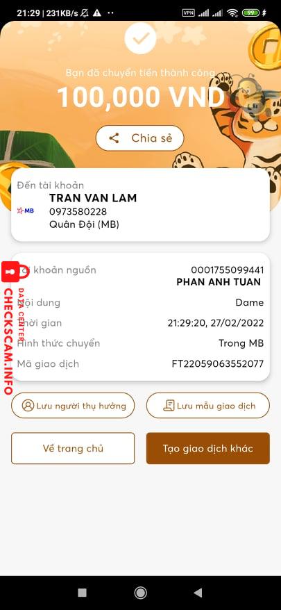 诈骗者警报: Trần Văn Lâm 已报告: November 16, 2024 诈骗者信息 全名: Trần Văn Lâm 电话号码: 0973580228 支付网关: Mb Bank 支付账户: 0973580228 类别: 市场诈骗 来源: Checkscam 证据文件 报告描述 Lừa đảo 350k dame nick không die và đã block 评论 您的评论 添加评论 暂无评论。成为第一个分享您与此诈骗者经历的人。