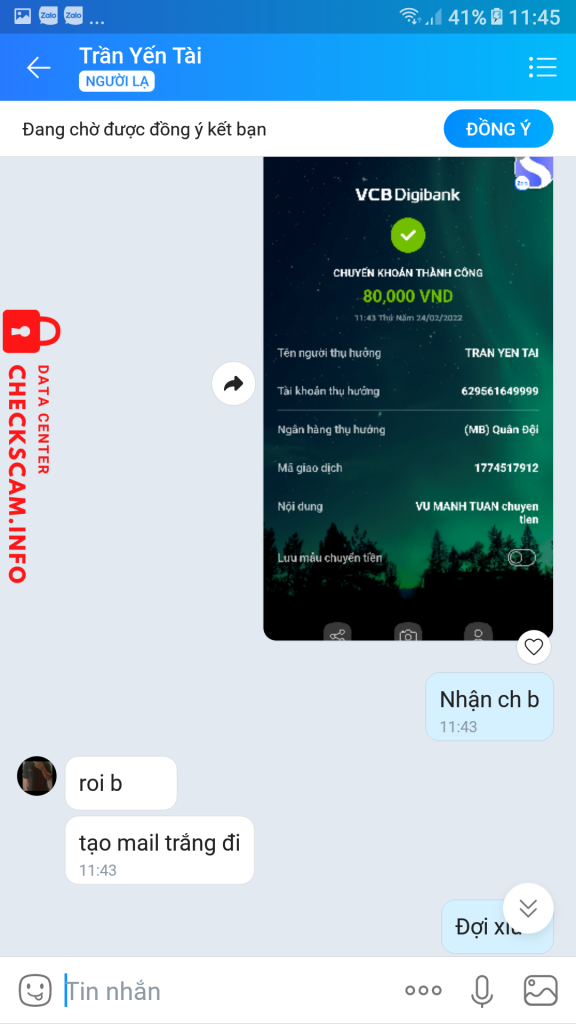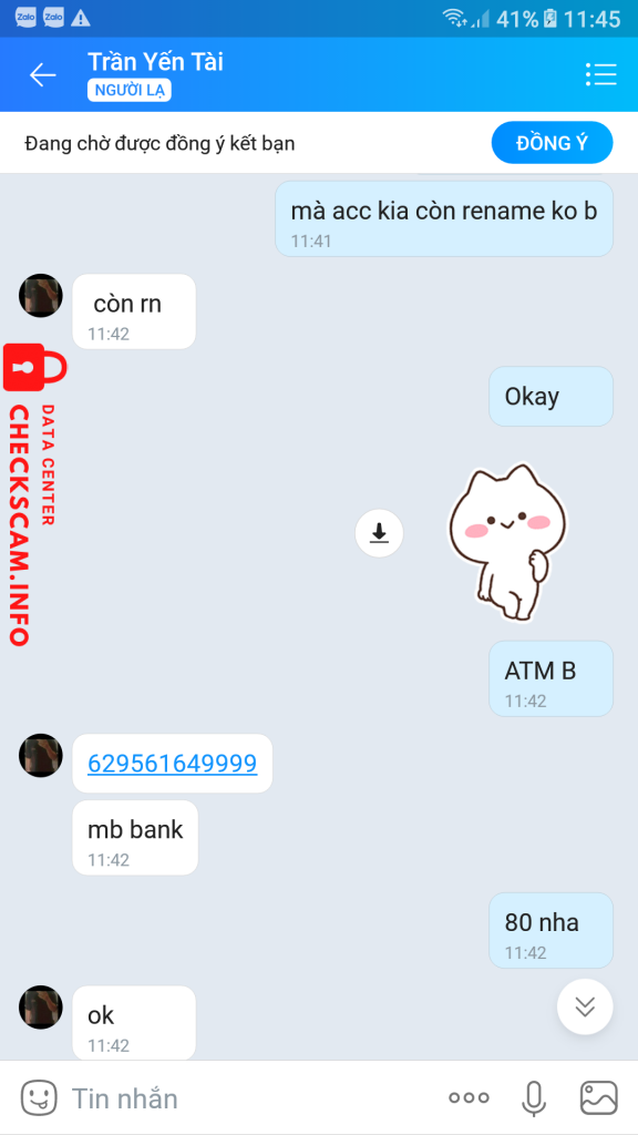 诈骗者警报: Trần Yến Tài 已报告: November 16, 2024 诈骗者信息 全名: Trần Yến Tài 支付网关: MB BANK 支付账户: 629561649999 类别: 市场诈骗 来源: Checkscam 证据文件 报告描述 Mua acc via bank xong block scam 80k 评论 您的评论 添加评论 暂无评论。成为第一个分享您与此诈骗者经历的人。