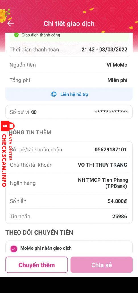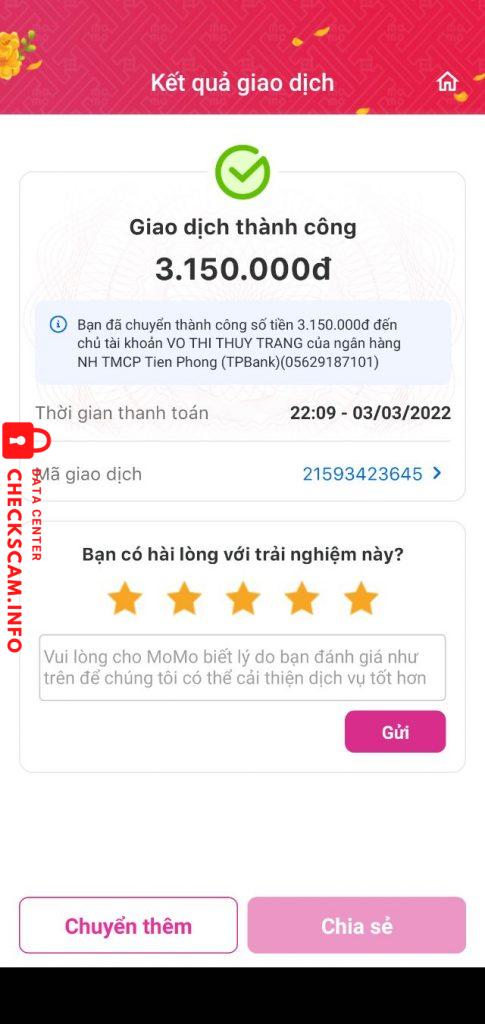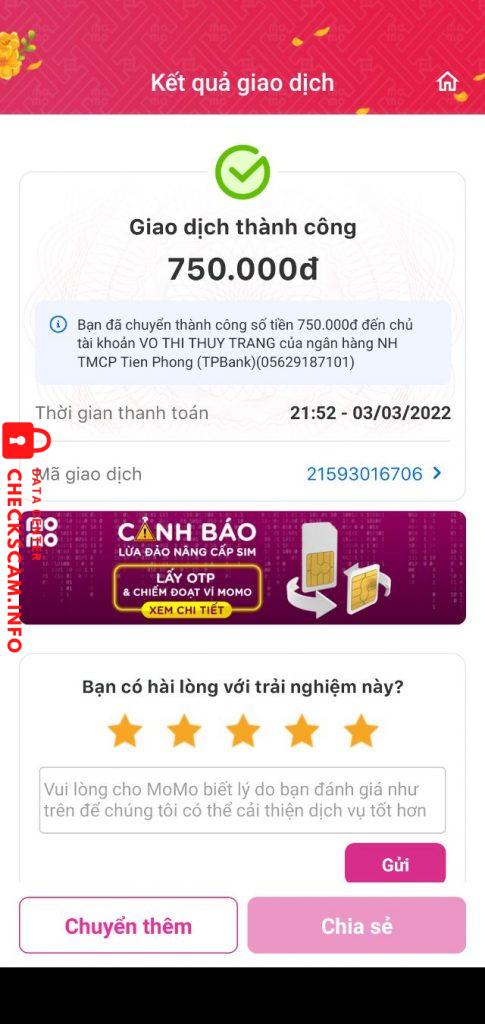 诈骗者警报: VO THI THUY TRANG 已报告: November 16, 2024 诈骗者信息 全名: VO THI THUY TRANG 支付网关: TPBANK 支付账户: 05629187101 类别: 市场诈骗 来源: Checkscam 证据文件 报告描述 Lừa mua hàng trên mạng của các trang lazada, shoppee… mua với giá ưu đãi và lấy hoa hồng, nhưng sau khi giao dịch chuyển khoản thì đóng băng 评论 您的评论 添加评论 暂无评论。成为第一个分享您与此诈骗者经历的人。