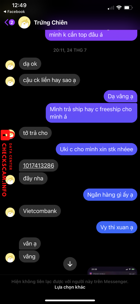 诈骗者警报: VY THI XUAN 已报告: November 16, 2024 诈骗者信息 全名: VY THI XUAN 支付网关: Vietcombank 支付账户: 1017413286 类别: 市场诈骗 来源: Checkscam 证据文件 报告描述 Lừa đảo card skz 200k 评论 您的评论 添加评论 暂无评论。成为第一个分享您与此诈骗者经历的人。